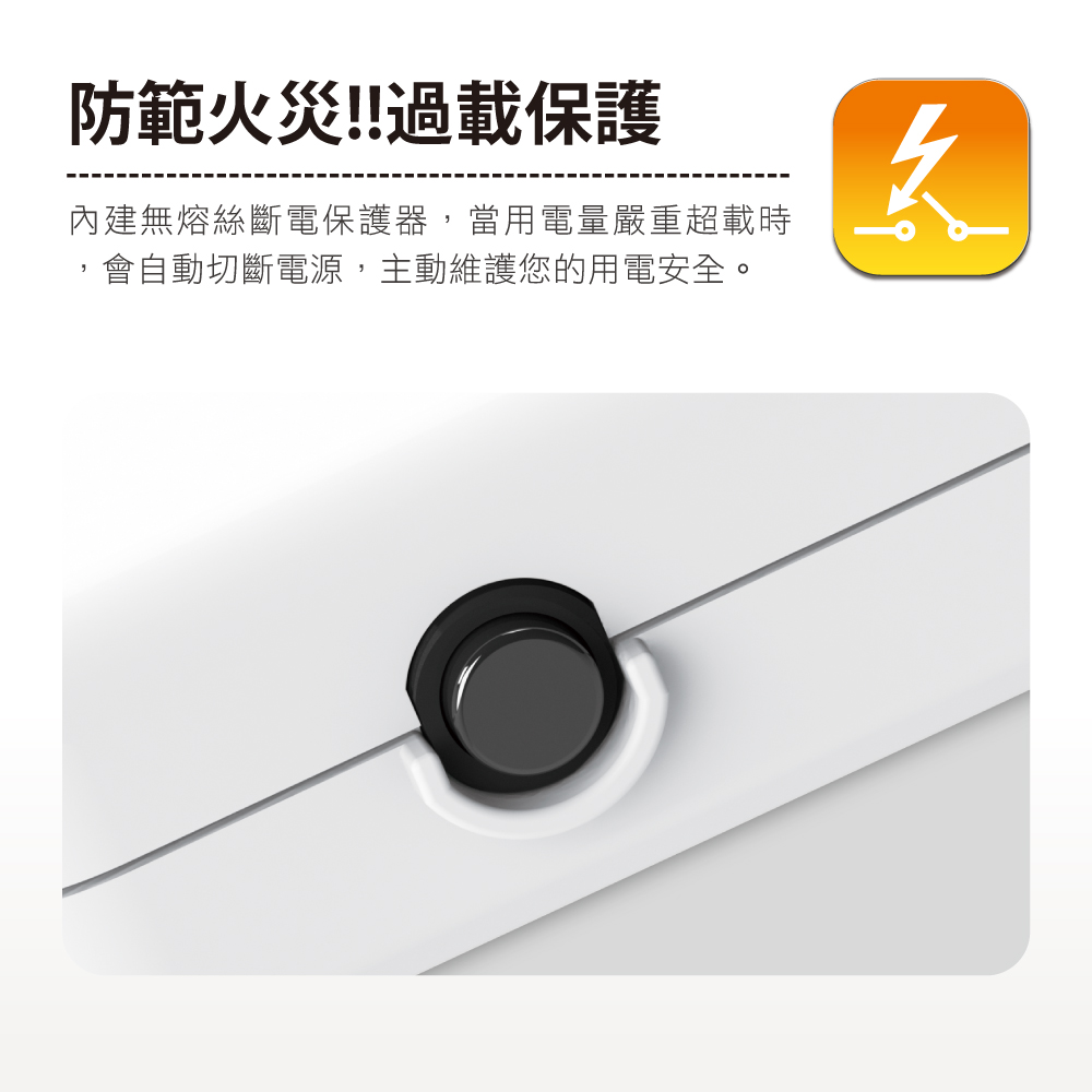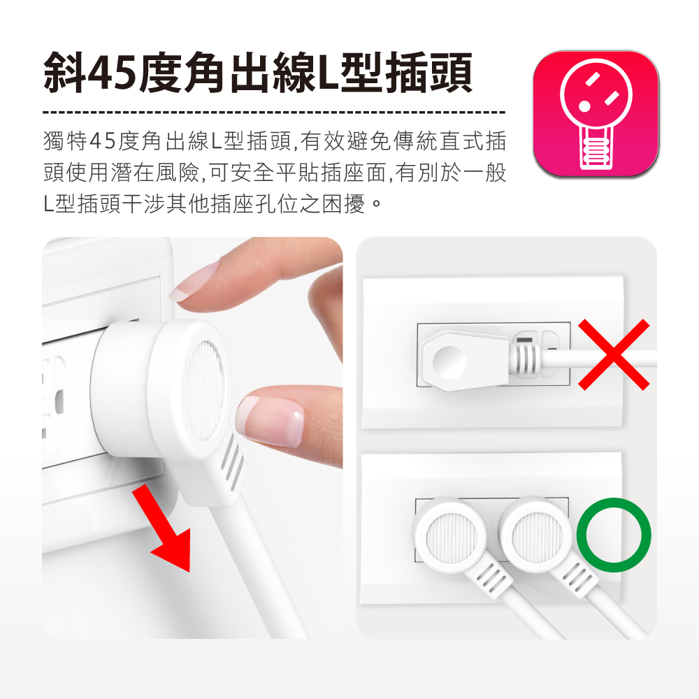 獨特斜45度角出線L型插頭高耐熱防火PC機身材質無熔絲過載自動斷電保護.商品線長: 4.5米 / 15尺 .本體尺寸:長 296 mm x 寬 53.6 mm x 高 25.4 mm(公差省略).主要材質:銅、聚碳酸酯(PC) .額定電壓:125VAC .額定電流:MAX 15A .適用電壓:110VAC / 60Hz .最大合計:MAX1,650W .最大突波吸收電壓:6000V(1.2/50μS) .最大突波吸收電流:4500A(8/20μS) .最大突波吸收能量:125焦耳(J)(10/1000μS) .插 座:3P(插孔) x 6插座(組) .驗證登錄:R64591 RoHS(BSMI) .商品保固:自購買日起,本產品提供12個月保固服務,若為天災、蟲(鼠)害、人為或產品匹配性因素,未依規定使用,恕不免費服務。 .產 地:台灣注意事項:●電源線在纏繞狀態下不易散熱,易發生燒熔危險,請先解開電源線再使用。●請勿在潮濕或高溫的環境下使用本產品,以免發生觸電或火災。●高功率電器用品如:電暖器、烘乾機、電鍋、烤箱、電磁爐、微波爐、移動式冷氣...等,請避免使用延長線轉接。●電源線請勿用U形釘固定或任意扭曲用力拉扯,以免破損發生危險。●請勿用重物擠壓電源線,以免電源線破損發熱,引起火災。●請勿用尖物碰觸電源線,以免電源線破損發熱或導致觸電。●切勿以潮濕的手觸摸或操作本產品,以免觸電危險。●建議使用電器前,先確認電器開關置於關閉狀態,於開啟本產品開關後,再啟動電器,如此動作可延長電器及本產品使用壽命。●並非每樣電器都適合使用延長線轉接,請詳細閱讀該電器使用說明後,斟酌使用,以免發生危險。●每種電器之功率不一定,為了預防意外,屬於高耗電量之電器應避免同一時間使用。●使用時,請務必將插頭完全插入插座中。●拔除插頭時,切勿直接拉扯電線。●嚴格禁止幼童自行使用本產品。●切勿自行拆解或進行修改。●請務必定期檢視延長線使用狀況,可避免危險發生。●使用老舊、破損或故障的延長線可能會造成短路漏電、火災等危險,應立即更新。●將延長線轉接於老舊、破損或積汙的插座,容易發生燒熔或電線走火。●將老舊、破損或積汙的電器插頭轉接於延長線上,亦容易發生燒熔或電線走火。●長時間接近滿載或超載使用,容易加速延長線老化或損壞,為了安全起見,建議最大合計使用功率不要超過本產品額定功率的80%。【本產品額定功率1650W,適用電壓110VAC/ 60Hz】●若突波超出最大吸收量,突波吸收器將損毀,即無法保護電器。●【緊急處理方式】:產品使用中,若有嚴重發燙或異味產生...等,異常現象發生時,應立即拔除插頭停止使用。