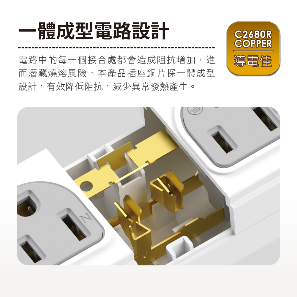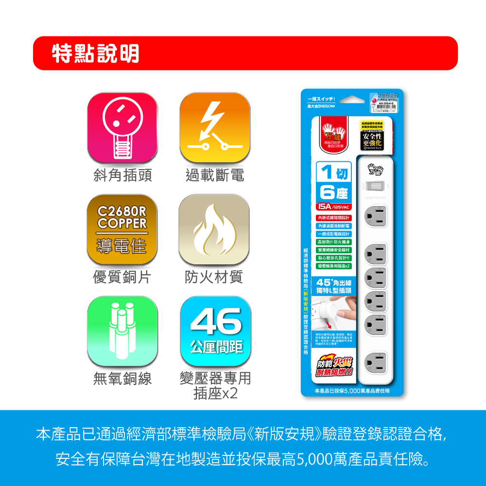 .本體尺寸:長278mmx寬42.5mmx高30.2mm.主要材質:銅、聚碳酸酯(PC).額定電壓:125VAC.額定電流:MAX 15A.適用電壓:110VAC/60Hz.額定功率:MAX 1,650W.插 座:3P(插孔) / 1開關 / 6插座.驗證登錄:R63608(BSMI).登錄型號:CT-3164.商品保固:自購買日起,本產品提供12個月保固服務若為天災、蟲(鼠)害、人為或產品匹配性因素未依規定使用,恕不免費服務.產 地:台灣.製造日期:詳見包裝.保存期限:10年(未拆封常態下)