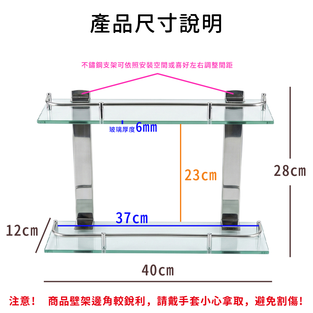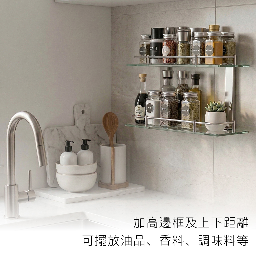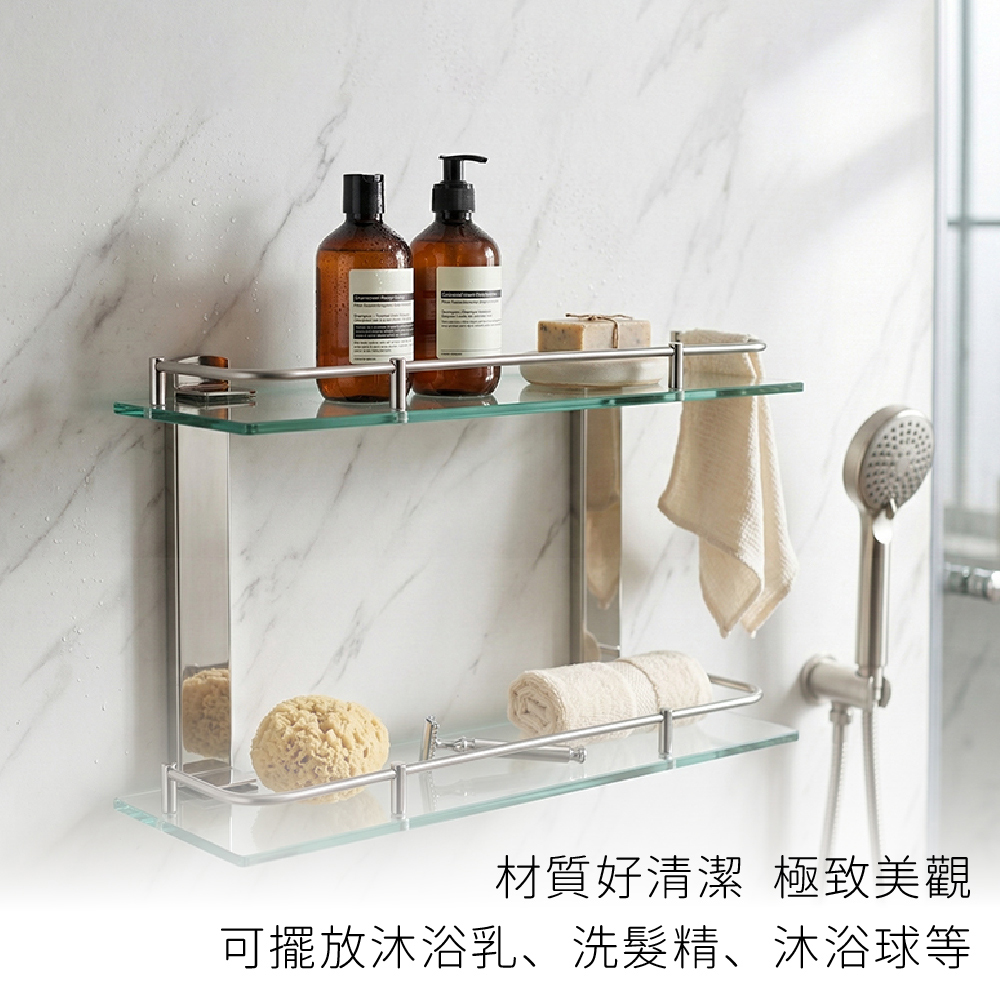 【雙手萬能】304不鏽鋼方型玻璃雙層置物架(浴室層架 瓶罐架 收納架)