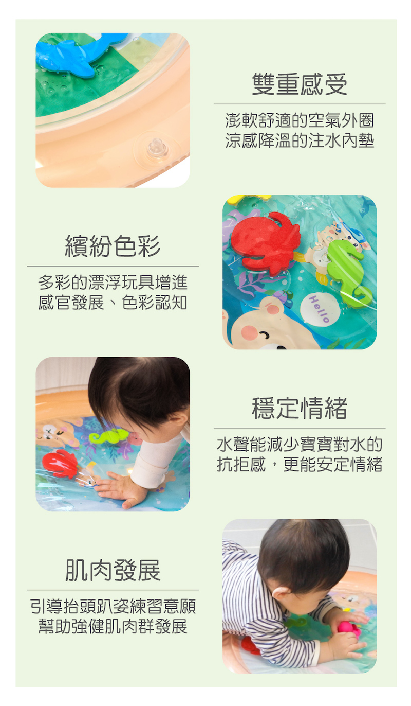 讓寶寶趴著玩!!增強頸、肩、背肌力,促進全身運動技能充氣加水後,內置色彩繽紛造型海綿會隨著施壓處飄動,吸引寶寶視覺注意,發展手眼協調充氣加水後,水墊可緩衝寶寶突然趴下所承受的重力