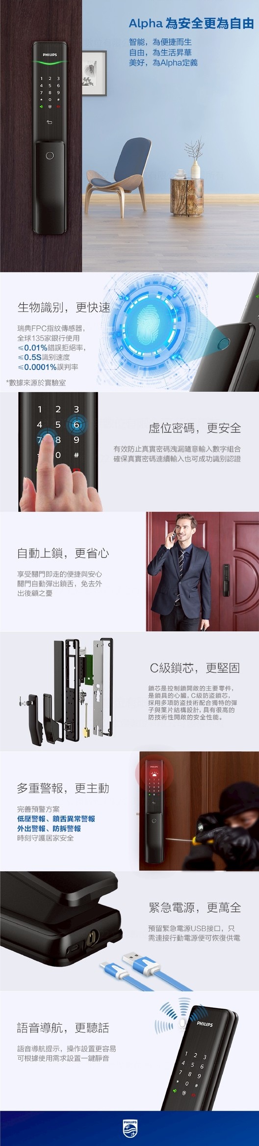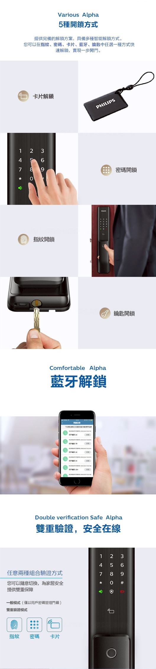 [山淬]Philips 飛利浦 ALPHA 五合一推拉式智能門鎖/電子鎖 曜石黑(指紋│卡片│密碼│鑰匙│WIFI/含基本安裝)