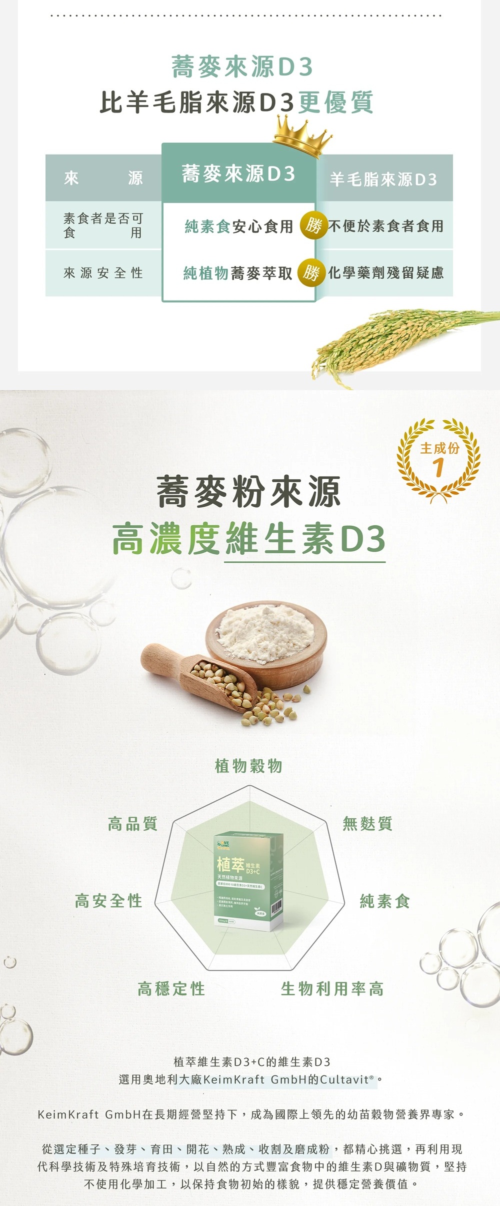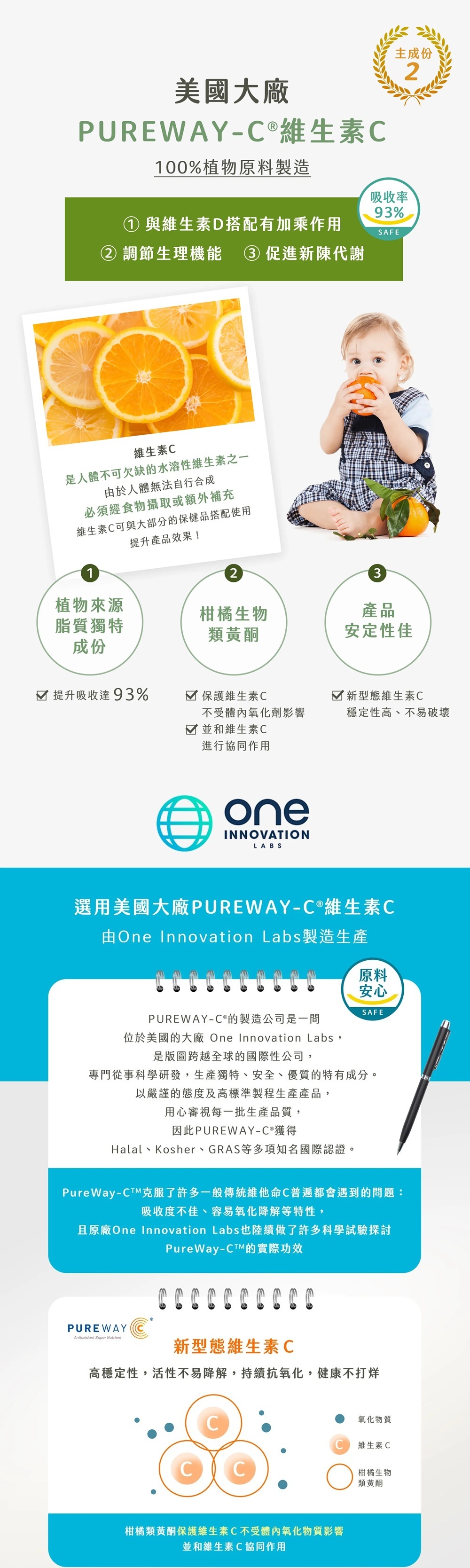Cultavit蕎麥粉 -經特殊培育技術之非基因改良之蕎麥芽研磨成粉.含有天然好吸收之維生素D3. 具有高生物利用率的特色蕎麥是優良纖維來源,不含麩質,且富含人體所需的必需胺基酸及微量元素PUREWAY-C®含植物來源脂質使維生素C,快速、安全、有效的方式進入細胞含天然柑橘生物類黃酮,保護維生素C不受體內氧化劑影響,並和維生素C進行協同作用。