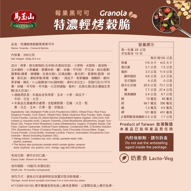 馬玉山特濃輕烤穀脆莓果黑可可 280g