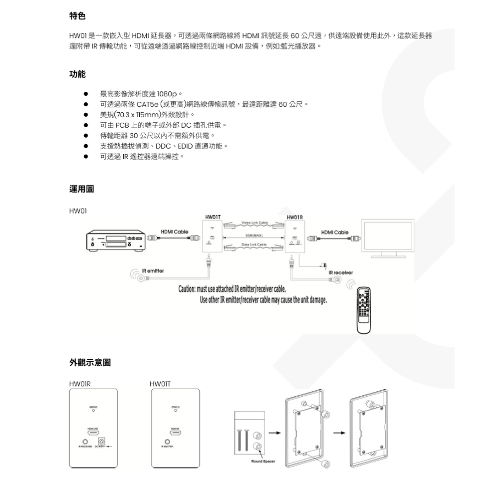 昌運監視器 HW01 HDMI/IR 嵌入式 CAT5e 網路線延長器(美規)