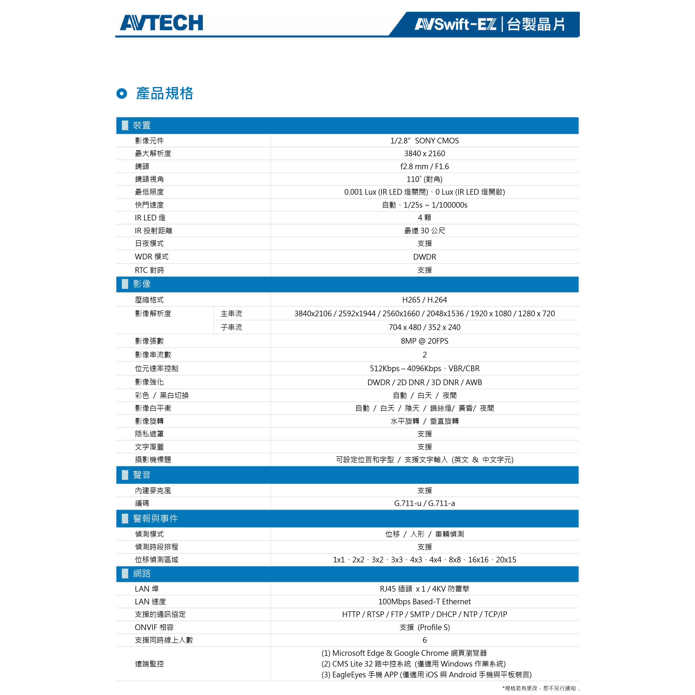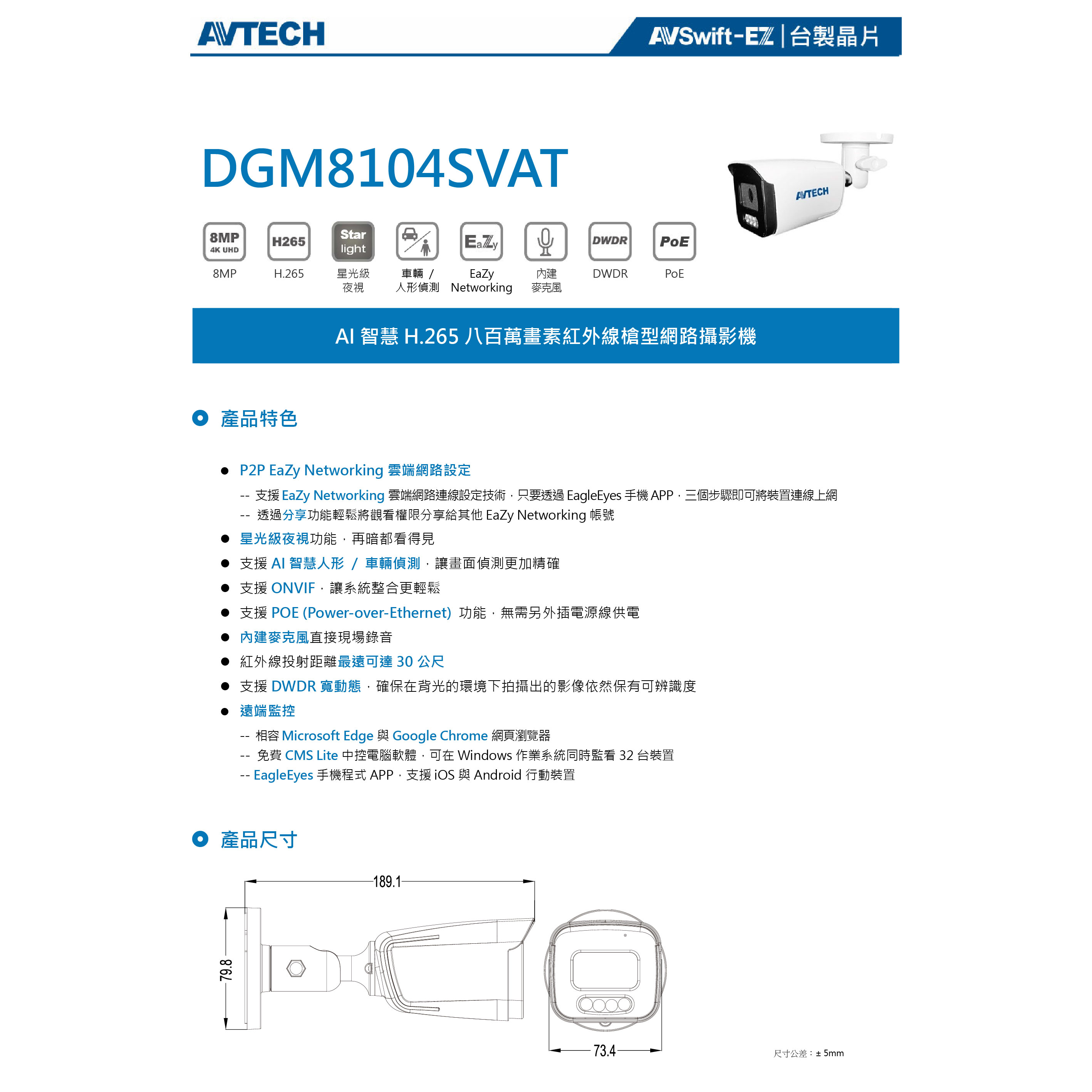 昌運監視器 AVTECH陞泰 DGM8104SVAT 800萬畫素 紅外線槍型網路攝影機 內建麥克風