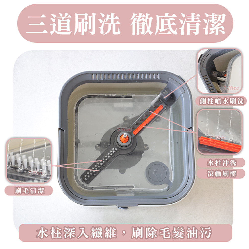 旋轉布盤,牆角低處無死角。去污刮齒+去污滾輪 髒污、灰沙無所遁形。淨水清洗,汙水隔離,2區分工,省時省力。