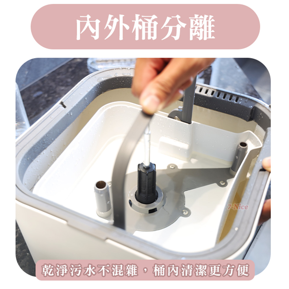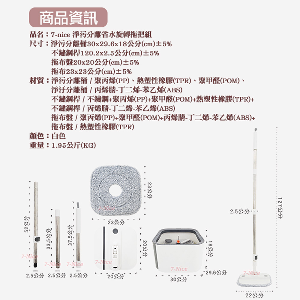 品名:7-Nice 淨污分離省水旋轉拖把組尺寸:淨污分離桶30x29.6x18公分(cm)土5% 不鏽鋼桿120.2x2.5公分(cm)土5% 拖布盤20x20公分(cm)土5% 拖布23x23公分(cm)土5%材質:淨污分離桶/聚丙烯(PP)、熱塑性橡膠(TPR)、聚甲醛(POM)、 淨汙分離桶/丙烯腈-丁二烯-苯乙烯(ABS) 不錯鋼桿/不錯鋼+聚丙烯(PP)+聚甲醛(POM)+熱塑性橡膠(TPR)+ 不鏽鋼桿/丙烯腈-丁二烯-苯乙烯(ABS) 拖布盤/聚丙烯(PP)+聚甲醛(POM)+丙烯睛-丁二烯-苯乙烯(ABS)+ 拖布盤/熱塑性橡膠(TPR)顔色:白色重量:1.95公斤(KG)