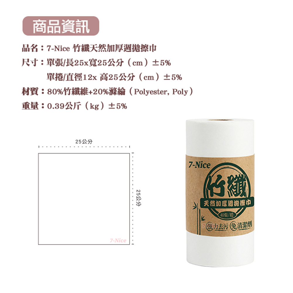 型號:70039 名稱:7-Nice竹纖天然加厚週拋擦巾 尺寸:單張/長25x寬25公分(cm)±5% 單捲/直徑12x 高25公分(cm)±5% 材質:80%竹纖維+20%滌綸(Polyester, Poly) 重量:0.39公斤(kg)±5% 產地:中國