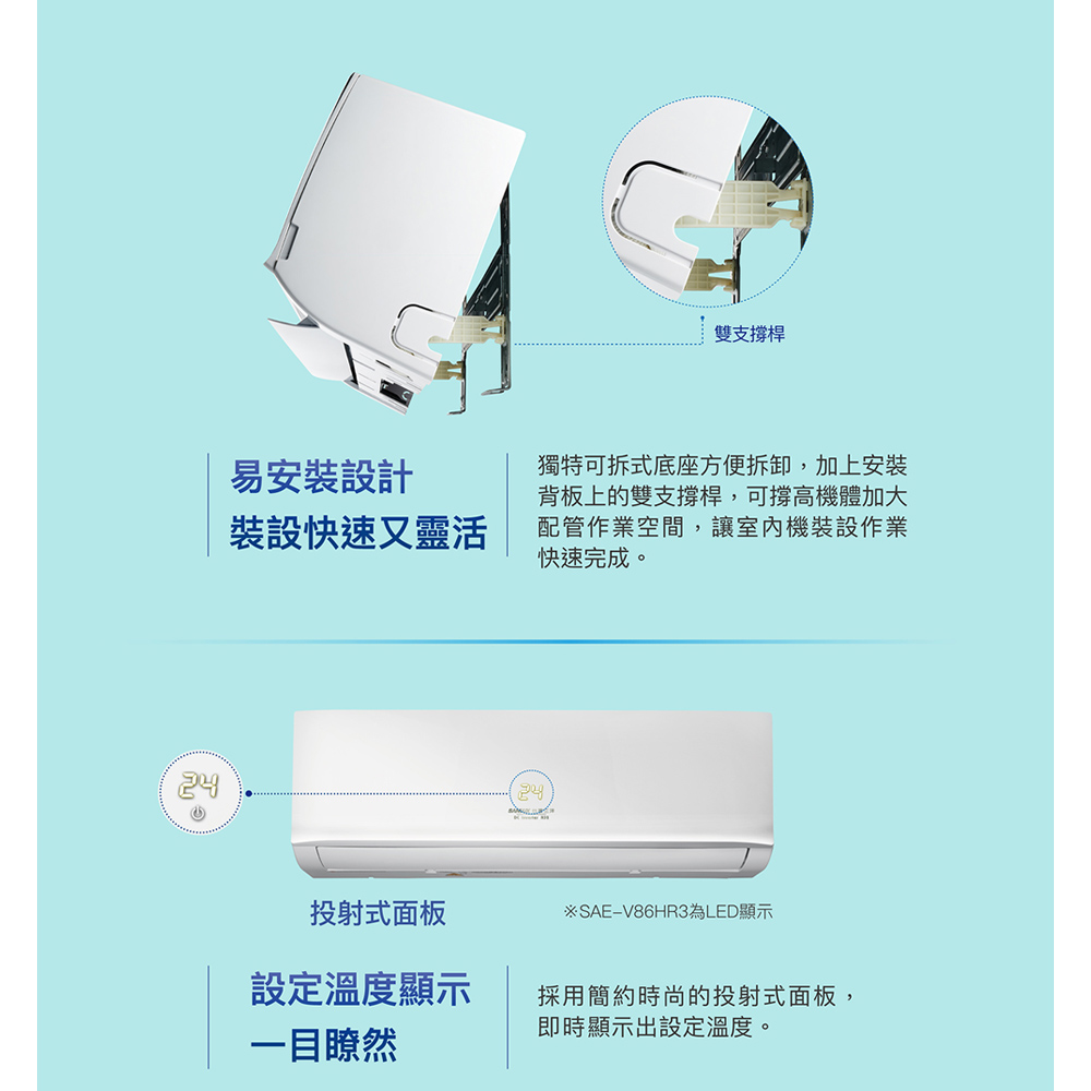 ■ 商品價格已含配送 標準安裝■ 若要配送安裝請先告知地區、樓層、有無舊機回收(雙北以外地區、偏遠地區、樓層無電梯需另加價)凡購買大型家電如冰箱、洗衣機、電視機、冷凍櫃…請先確認家電需經過的通道及所放位置空間是否足夠,如走道、電梯、樓梯間轉彎處,須有良好動線。如因這些問題造成無法配送安裝的話,會產生空趟費,須由消費者負擔喔~~🔥 重要提醒 🔥 大型家電請安裝好後,請務必確認好商品外觀完整無誤再簽收喔!! 簽收完畢後,商品外觀部分由消費者自行承擔!!◆消費權益◆■ 鑑賞期並非"試用期"。■ 退貨商品需是「全新商品」且「包裝完整」,包括外箱、包材、贈品等原廠所有配件,缺件、刮傷皆不同意退換貨。■ 大型家電一經拆箱定位安裝、插電及使用後,除原廠鑑定為商品問題外,不得以其他個人理由退換貨。■ 商品簽收前請務必確認商品型號、顏色正確,一經簽收即代表同意,不得以其他個人理由退換貨。■ 對商品有疑慮的地方請務必先詢問,能接受再訂購!■ 商品送達後若因買家因素無法安裝或拒收,買家需負擔賣家出貨產生的物流費用商品特色:冷暖四季型室溫投影式面板銀銅鈦抑菌清淨濾網靜音、省電、安眠定時開.關機單獨除溼萬能風向液晶無線遙控銀銅鈦濾網全機防鏽商品規格:室內機:SAE-V36HR3室外機:SAC-V36HR3電壓 (V):(電源60Hz單相3線):220V冷/暖房能力 kW:額定:冷 3.6 暖 3.6消耗能力(kW):冷 0.89 暖 0.89冷氣季節性能因數CSPF:冷 6.23 暖 6.23運轉電流A:冷 4.40 暖 4.40除溼量L/H:1.0重量(kg):室內機重量:8.5室外機重量:29.0外型尺寸(cm):室內機尺寸:高 27.0 寬 81.5 深 21.0室外機尺寸:高 54.0 寬 85.3 深 26.0冷媒配管:液管:2分氣管:3分配電方式:室外供電連接線(蕊):3室外機安裝固定腳孔距:寬(cm):53.0深(cm):29.0年耗電量 度/年:687能源效率等級:1冷媒種類:環保冷媒R32保固:全機七年,壓縮機十年,如有異動以原廠公告為主產地:中國貨源:公司貨BSMI:R-31005本商品資訊由網路及官網收集彙整而成,僅供參考,如有更新或異動不另外通知,正確商品資訊及規格以實機為準。鑑賞期非試用期,產品一經拆箱、插電及使用皆會影響您退貨權利。廢四機回收資訊:新購公告指定規格之電視機、洗衣機、電冰箱或冷、暖氣機時,販賣業者應提供同項目、數量、時間及同送達地址之廢四機回收(搬、載運)無償服務。但不包含為搬運、拆卸而動用大型機具、工程或危險施工等。消費者本人簽名確認已被口頭告知或知悉上述權益。本站配合環保署廢四機回收服務,本公司廢四機回收專線:0800-550678,環保署資源回收專線0800-085717。