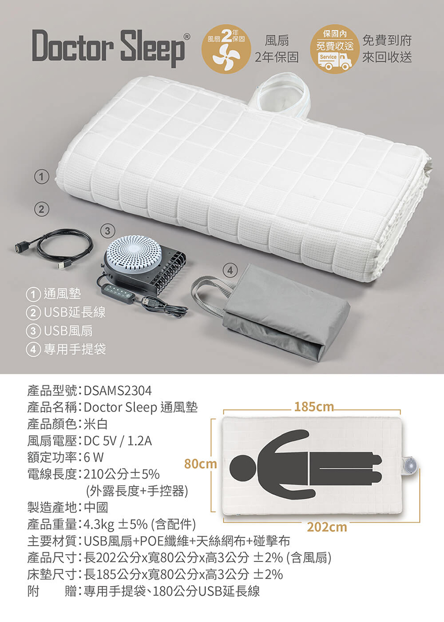 品名:Doctor Sleep 通風墊產品型號: BY010091數量:1組產品顏色:米白產品尺寸:長202公分x寬80公分x高3公分 ±2% (含風扇)床墊尺寸:長185公分x寬80公分x高3公分 ±2%產品重量:4.3kg ±5% (含配件)主要材質:USB風扇+POE纖維+天絲網布+碰擊布風扇電壓:DC 5V / 1.2A額定功率:6 W電線長度:210公分(外露長度+手控器) ±2%製造產地:中國包裝內容物:POE纖維通風墊x1 + USB風扇x1 + 手提袋+USB延長線180公分於購買日期(或製造日期)起730日內,【風扇】非人為不當使用的新品故障瑕疵維修,由本公司派車【免費來回收送】維修,所產生的費用由本公司全額負擔。(限台灣本島內收送)【風扇】在正常使用範圍內,享有自購買日期(或製造日期)起算24個月內,【風扇】零件免費維修更換的保固服務。※顏色:如產品圖示,網頁圖片因拍攝關係,若與實品略有差異,顏色以實際出貨為主。※鑑賞期內如需退換貨,商品本身、贈品、包裝彩盒均務必保持完整齊全。※機器使用中,孩童應受監護,禁止孩童嬉玩電器,避免發生危險。※風扇務必將濾心置入,以避免異物捲入導致危險