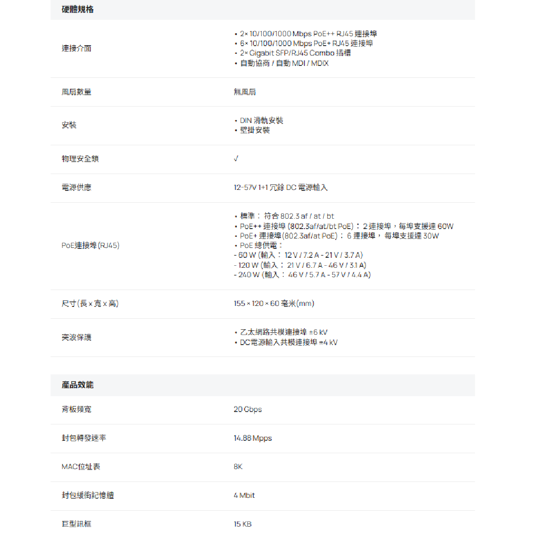 8× Gigabit RJ45 連接埠(2× PoE++ & 6× PoE+)