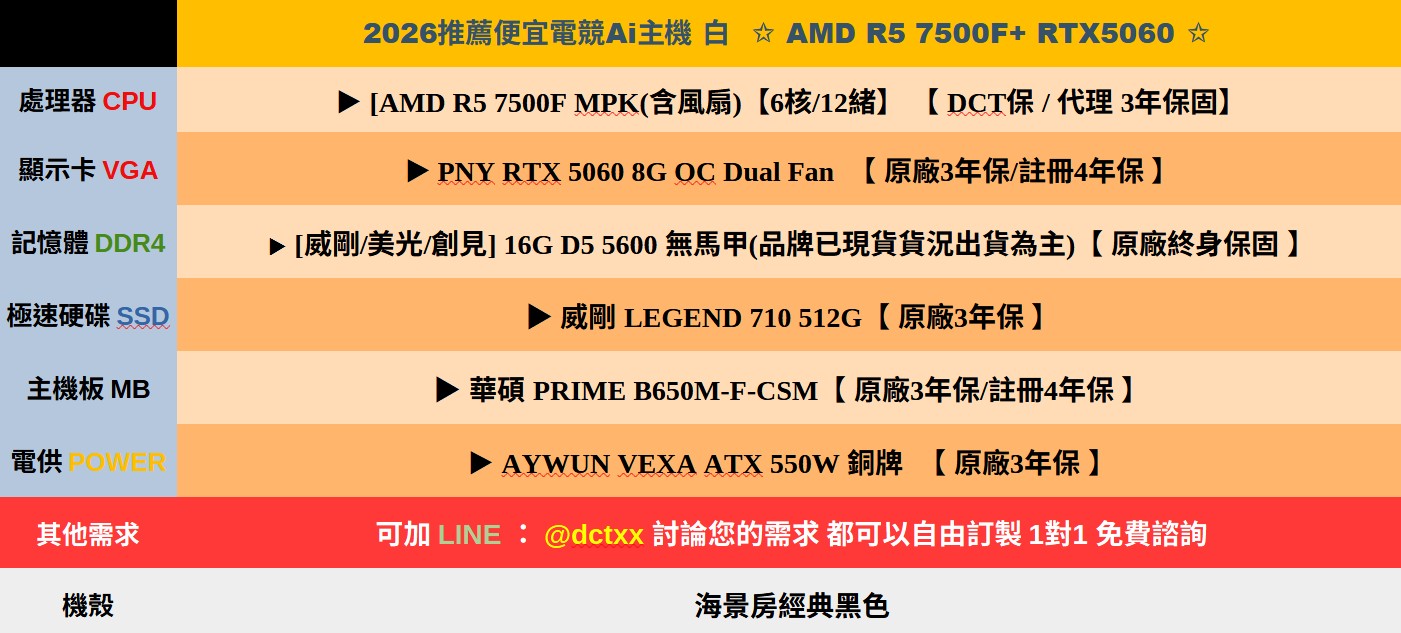 2026推薦便宜電競Ai主機⭐AMD R5 7500F+RTX5060⭐10天出貨( B製程 )