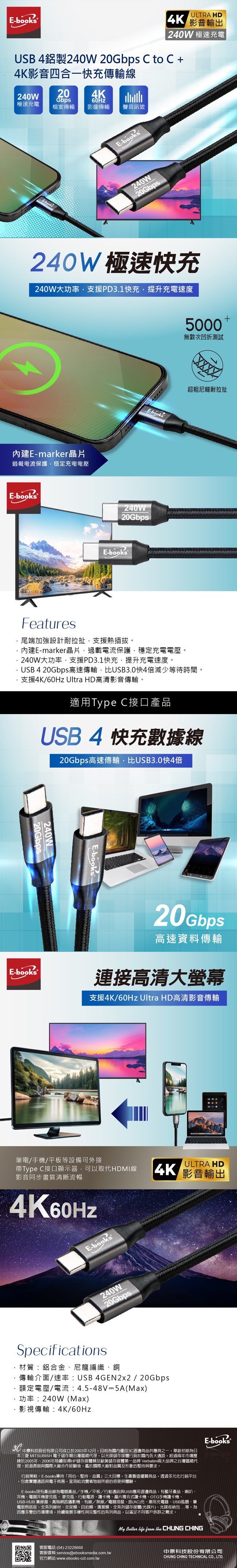 [ E-books ] XA65 USB4鋁製240W 20Gbps C to C + 4K影音四合一快充傳輸線-1M