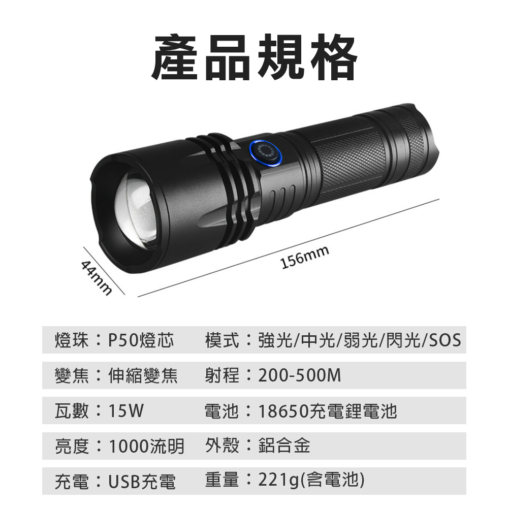 台灣現貨!P50強光手電筒 鋁合金 伸縮變焦 露營燈 Type-C USB充電手電筒 LED手電筒