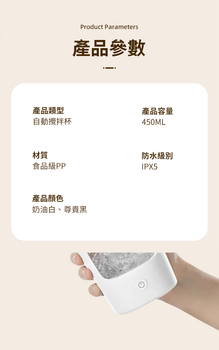 顏色:奶油白、尊貴黑容量:450ML材質:食品級PP防水級別:IPX5重量:300g外盒尺寸:18*9*11cm