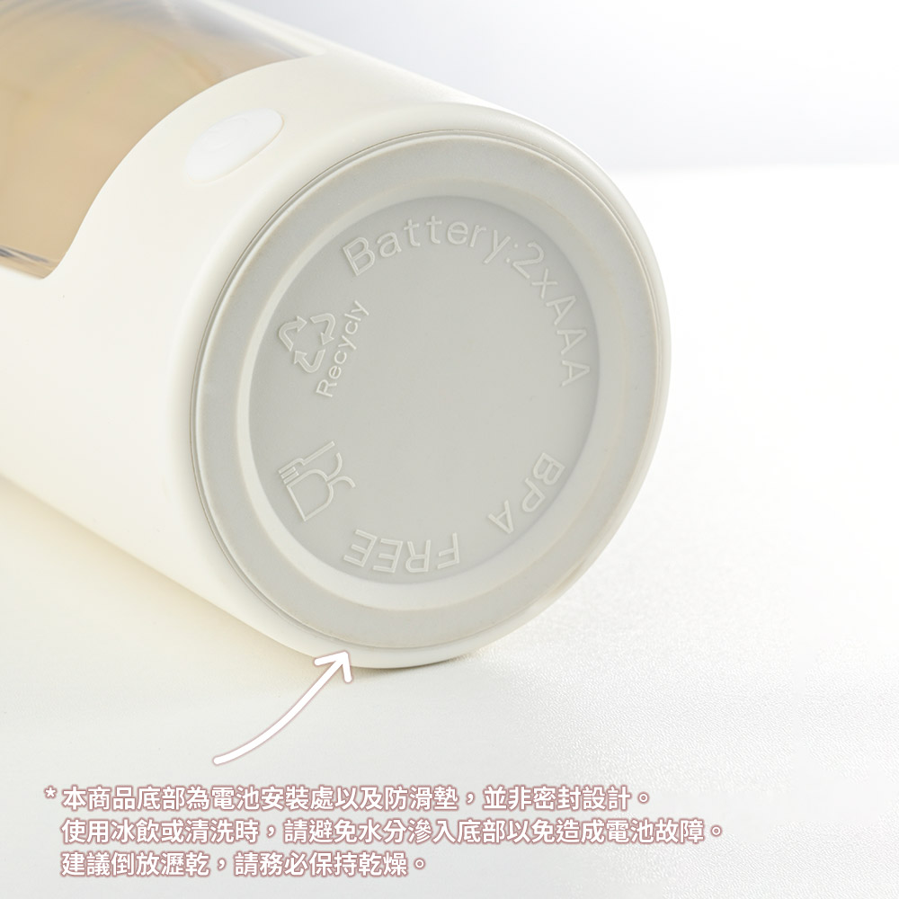 📌【貼心提醒】 ※因平舖直量測量方法不同,1-2cm 誤差屬正常範圍 ※因顯示差異及拍攝光線,照片與實品可能會存在輕微色差 ※退貨請維持外包裝及內容物的完整性,以免造成退貨的權益 ⚠本商品底部為電池安裝處以及防滑墊,並非密封設計。 使用冰飲或清洗時,請避免水分滲入底部以免造成電池故障。 建議倒放瀝乾,請務必保持乾燥!
