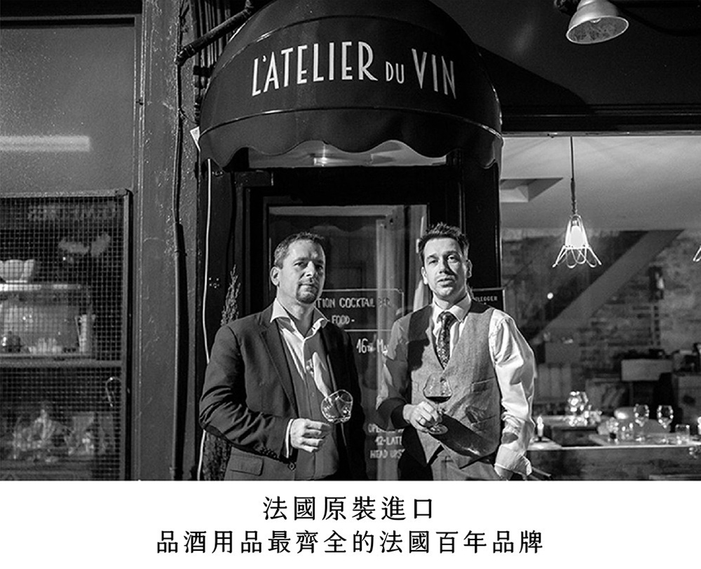 來自法國的 L'Atelier du Vin 創立於 1926 年,家族本身擁有廣大的葡萄園及自有香檳品牌,憑藉著葡萄酒釀造廠的豐富管理經驗,將專業自酒窖延伸至餐桌。研發擁有強烈自我風格,兼具實用性與時尚潮流,更貼近居家消費者需求的酒器類商品。L'Atelier du Vin 擁有全球品項最齊全的葡萄酒、香檳專業周邊商品專賣店的稱號,獨特的專業品牌魅力席捲全球,在法國最知名的拉法葉百貨及巴黎有超過30家分店。