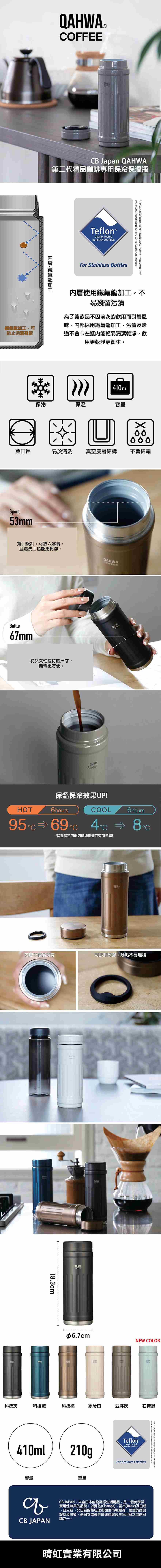 材質:本體-不鏽鋼/內部-氟素樹脂塗裝/杯蓋-不鏽鋼、聚丙烯、矽膠保溫效果:69℃以上(6小時後)保冷效果:8℃以下(6小時後)尺寸:Φ 67xH183 mm容量:410ml重量:210g產地:日本授權中國生產