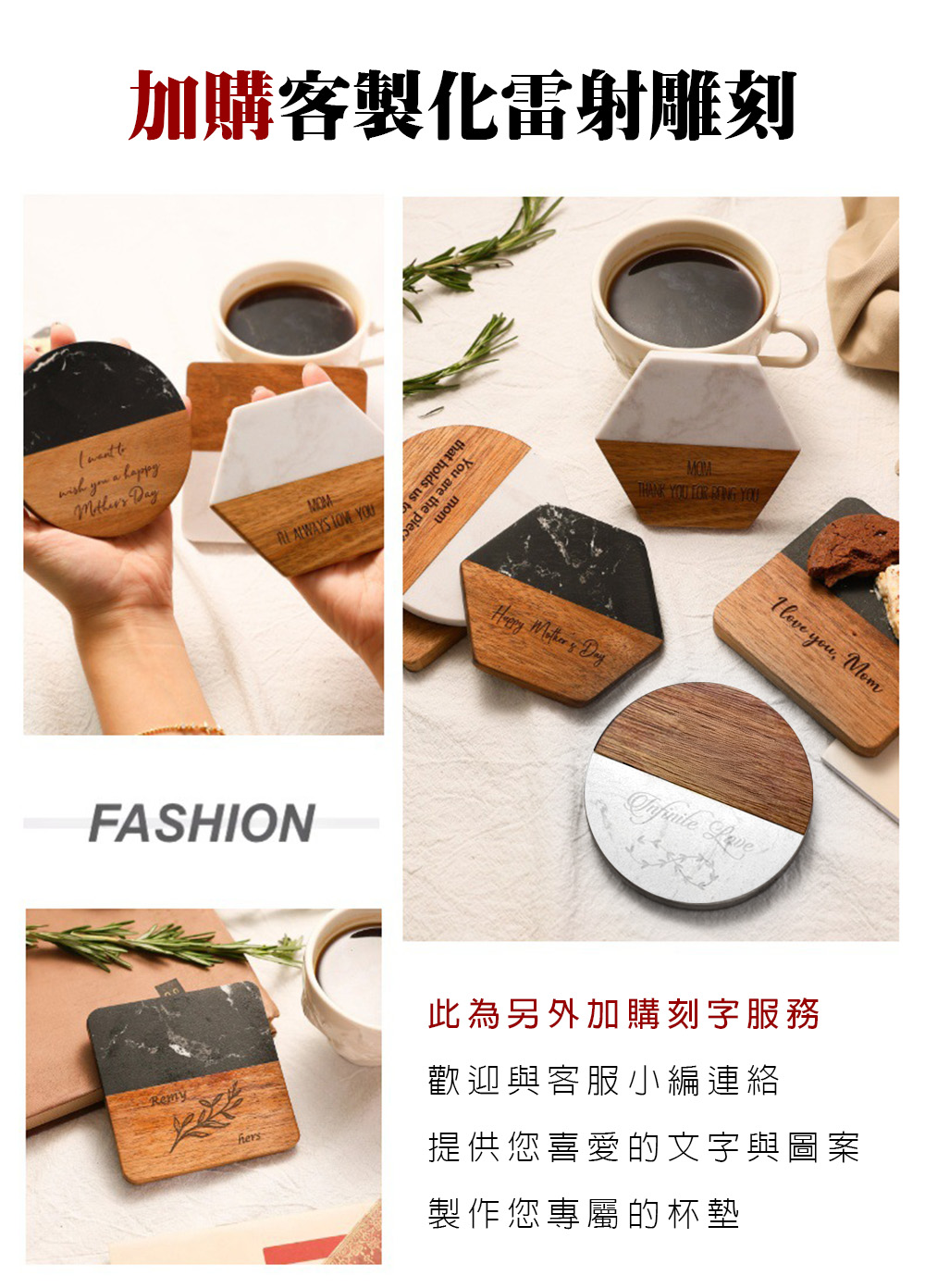 ✨ 質感生活,從這款大理石拼接杯墊開始! ✨精選相思木搭配質感大理石拼接而成,為您的咖啡時光增添獨特品味 🤎溫潤木質搭配細膩石紋,呈現出既現代又溫暖的居家風格。提供黑、白2色,3種幾何造型為你的居家品味增添獨特風格🏡。🔸 特色亮點:✔ 高級拼接工藝 – 簡約設計,提升桌面品味✔ 精緻手感 – 10×10cm大小,1cm厚度,扎實有質感👌✔ 客製化雷射刻字 – 刻上名字、祝福語,打造專屬禮物🎁💖無論是 送禮 或 自用,這款杯墊都是你的質感首選!📌 賣場圖下方加購,擁有獨一無二的刻字杯墊!【產品信息】品名:相思木大理石拼接杯墊材質:相思木原木、人造大理石尺寸:10*10cm厚度:1cm重量:圓形-135g、方形-145g、六角形-105g