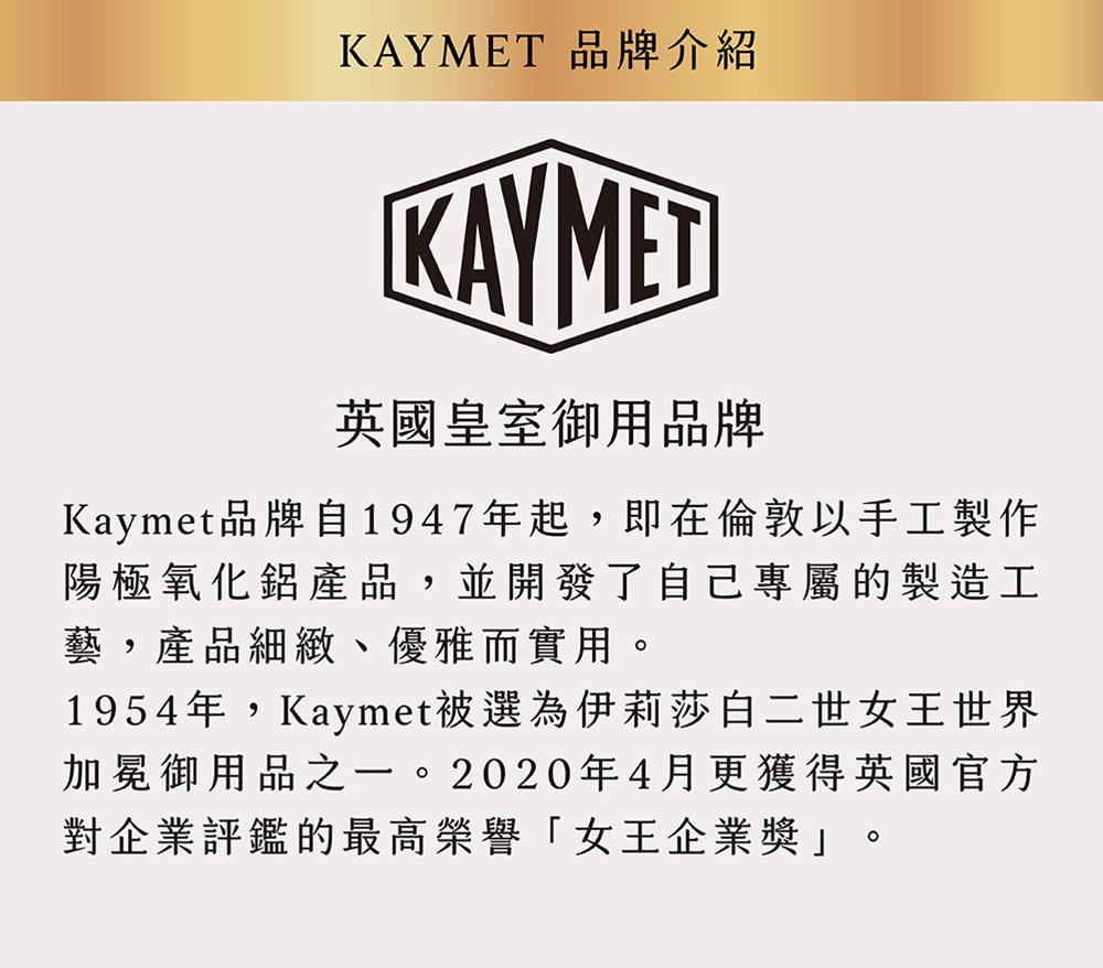 Kaymet品牌自1947年起,即在倫敦以手工製做陽極氧化鋁產品,並開發了自己專屬的製造工藝,產品細緻、優雅而實用。1954年,Kaymet被選為伊麗莎白二世女王世界加冕御用品之一,2020年4月更獲得英國官方對企業評鑑的最高榮譽「女王企業獎」