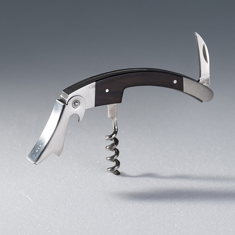 黑木開瓶器黑色天然硬木質感與不鏽鋼材質訂製,保留傳統法國酒吧喜愛的開瓶器風格,及鋁箔切割多功能一體成型的設計。