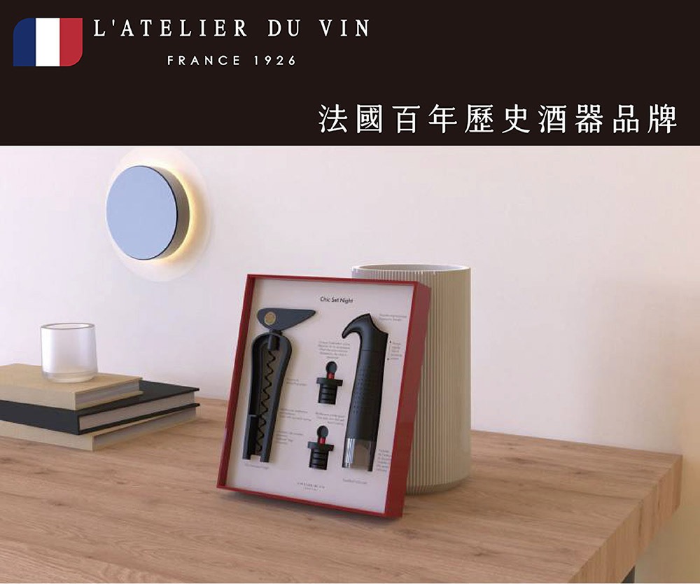來自法國的 L'Atelier du Vin 創立於 1926 年,家族本身擁有廣大的葡萄園及自有香檳品牌,憑藉著葡萄酒釀造廠的豐富管理經驗,將專業自酒窖延伸至餐桌。研發擁有強烈自我風格,兼具實用性與時尚潮流,更貼近居家消費者需求的酒器類商品。L'Atelier du Vin 擁有全球品項最齊全的葡萄酒、香檳專業周邊商品專賣店的稱號,獨特的專業品牌魅力席捲全球,在法國最知名的拉法葉百貨及巴黎有超過30家分店。