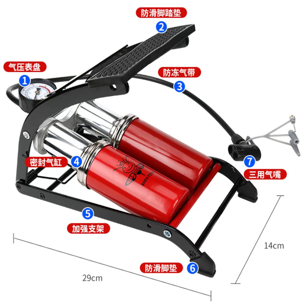 腳踩式高壓雙管打氣筒,打氣充氣不費力,輕巧便攜,可折疊收納,不佔空間