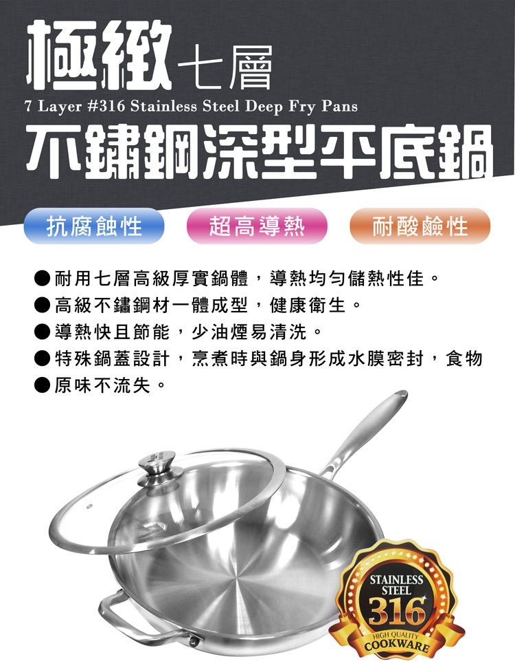 臺灣製造品質保証,通過SGS檢驗合格,採用316不鏽鋼精工製造,內層316不鏽鋼板製造,外層導磁不銹鋼,中間五層合金,鍋身厚度2.7mm,傳熱快速,導熱更均勻,深型設計只需中小火即可達到抗黏性及不沾效果,具高儲熱功能容易清洗,適用瓦斯爐、電磁爐、電爐、陶瓷爐。