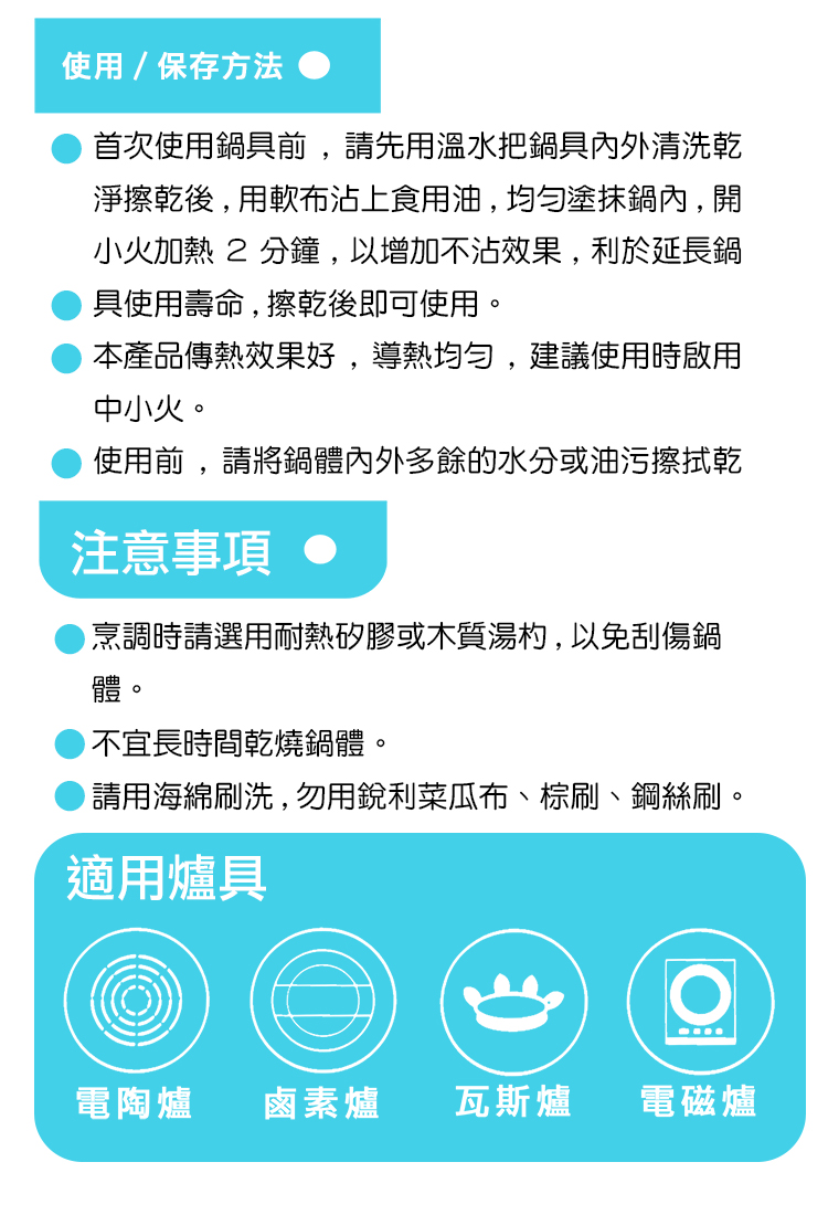 注意事項: 初次使用請用中性洗潔劑以海棉充份洗淨。烹煮完成後,利用鍋子的餘溫清洗鍋子,可讓您減少清潔劑的使用,而且更簡單省力。可使用軟質菜瓜布或海綿類清洗,請勿使用鍋鏟杓、鐵刷、鋼絲球,延長使用壽命。禁止用於微波爐。嚴禁空燒。 棉布沾少許食用油在鍋內塗之濕潤,烹調時只需少量食用油即可不沾鍋身。 使用中時鍋體和手把金屬部份會變熱請小心注意。 每次烹飪完畢時,請務必將鍋內水分清理乾淨,請勿置放長時或隔夜。 鍋具表層請不要用鍋鏟杓敲擊,避免出現凹點或痕跡影響鍋面品質。