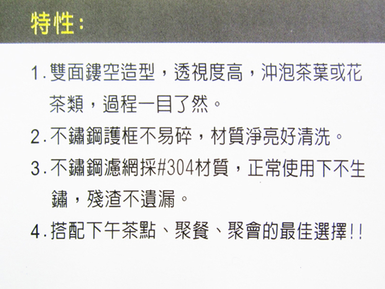 不銹鋼護框不易碎,耐熱玻璃材質,#304不銹鋼濾網設計,茶葉容易沖開,適合沖泡茶葉、花茶等,高透視度,沖泡中色澤一目了然,日式造型設計,展現優雅風采,優雅風格,提升時尚精緻感。