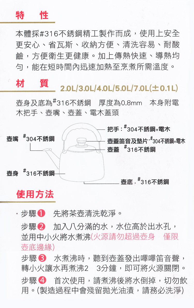 通過SGS檢驗合格 ,壺身一體成型設計方便清洗,採用醫療級316加厚0.8mm不鏽鋼,耐酸鹼抗腐蝕,堅固耐用品質優良,導熱均勻快速節能省時,不氧化,不腐蝕,不易產生水垢,優雅造型體面大方,壺蓋響音提醒功能設計,讓您可以隨時掌握水沸騰的時間,不在廚房內也可聽到聲音,使用安全,耐高溫防滑把手設計好握好拿,出水孔加蓋設計,防止異物侵入,適用IH電磁爐、卥素爐、紅外線爐、電爐、瓦斯爐。
