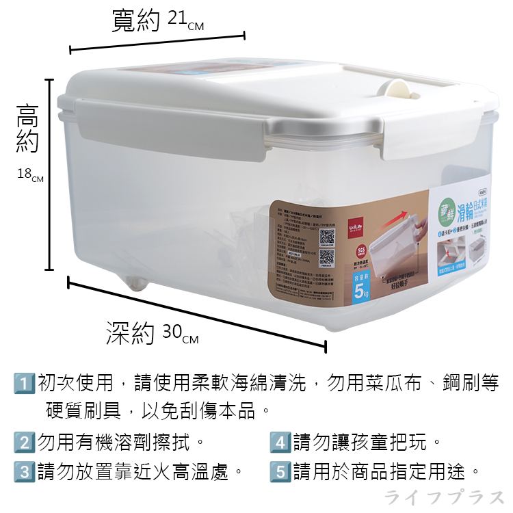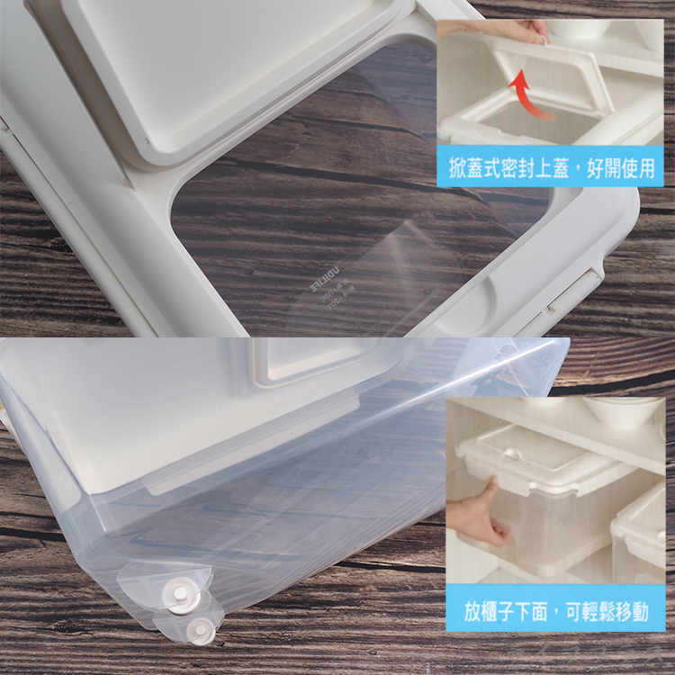 SGS 檢驗合格使用安心,掀蓋式密封上蓋,密封保鮮,附扁平量杯標示設計,4道卡扣+2重密封條,五穀雜糧隨心置放,可當米桶、食物、雜物收納盒,多用途使用,底部滑輪+凹槽手把設計,好拉順手,雅緻巧思,廚房煮飯好幫手。