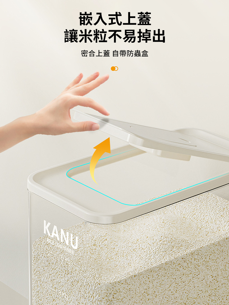 ● 大口徑桶口 方便日常添米● 貼心刻度 量化出米● 嵌入式上蓋 米粒不易掉出規格:10斤裝顏色:白色材質:PET尺寸:15.5*28.5*28cm重量:1.6kg