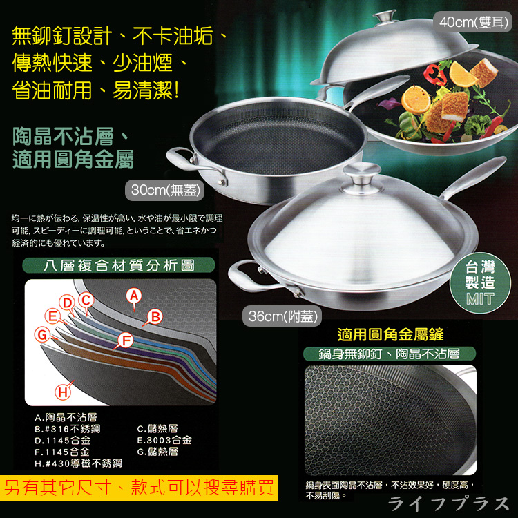 精廚工藝設計,臺灣製造品質保証,通過SGS檢驗合格,內層採用頂級316不鏽鋼材質,多層複合金結構,適用圓角不鏽鋼煎匙,一體成形耐酸鹼,抗腐蝕,儲熱性佳,導熱快,時尚設計妝點廚房,流線把手提感極佳,雅緻巧思美觀大方,八角網紋結構陶晶不沾保護層,煎煮食材只需少許油,易清洗 ,傳熱快且均勻,聚熱快,散熱慢,少油煙,耐用,省油,省瓦斯,適用瓦斯爐、電磁爐、紅外線爐、電爐、鹵素爐。