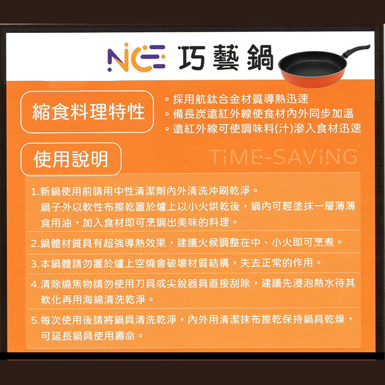 在廚房中,擁有一款優質的鍋具是烹飪成功的關鍵,此款鍋具台灣製造品質安心,通過SGS檢測品質安心,採用航鈦合金材質精工製作,不卡油垢好清洗,傳熱快且均勻,採用備長炭遠紅外線耐用不沾塗層處理,達到不沾鍋身抗黏OK,不易粘黏食材,煎煮食材只需少許油 ,省油,省瓦斯,料理食物好鍋具,適用瓦斯爐、電陶爐、紅外線爐、鹵素爐、電爐,不適用IH電磁爐,讓您輕鬆掌控每一道料理。