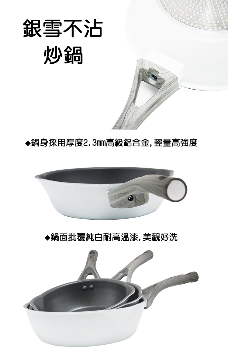 通過SGS材質檢驗標準,使用安心,鍋身採用厚度2.3mm合金,鍋身外面批覆純白耐高溫漆,外觀時尚妝點廚房,塗層採用日本大金不沾塗層,耐用不沾處理,煎煮食材只需少許油,達到食材不沾黏,易清洗,不留食物殘味,極輕量導熱更均勻,儲熱性佳,料理食物好鍋具,IH電磁爐對應設計,適用瓦斯爐、電爐、鹵素爐、紅外線爐,雅緻巧思美觀大方。