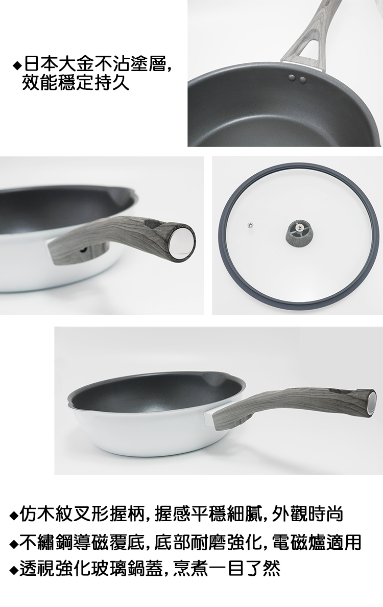 通過SGS材質檢驗標準,使用安心,鍋身採用厚度2.3mm合金,鍋身外面批覆純白耐高溫漆,外觀時尚妝點廚房,塗層採用日本大金不沾塗層,耐用不沾處理,煎煮食材只需少許油,達到食材不沾黏,易清洗,不留食物殘味,極輕量導熱更均勻,儲熱性佳,料理食物好鍋具,IH電磁爐對應設計,適用瓦斯爐、電爐、鹵素爐、紅外線爐,雅緻巧思美觀大方。
