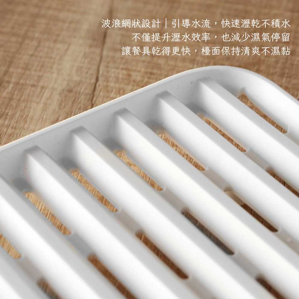 波浪網格構造|自動導流不積垢: 獨特的波浪起伏盤面,能讓洗後殘留的水滴順著溝槽自動匯集流向水槽,徹底告別傳統平底瀝水架容易積水發霉、產生異味的煩惱。