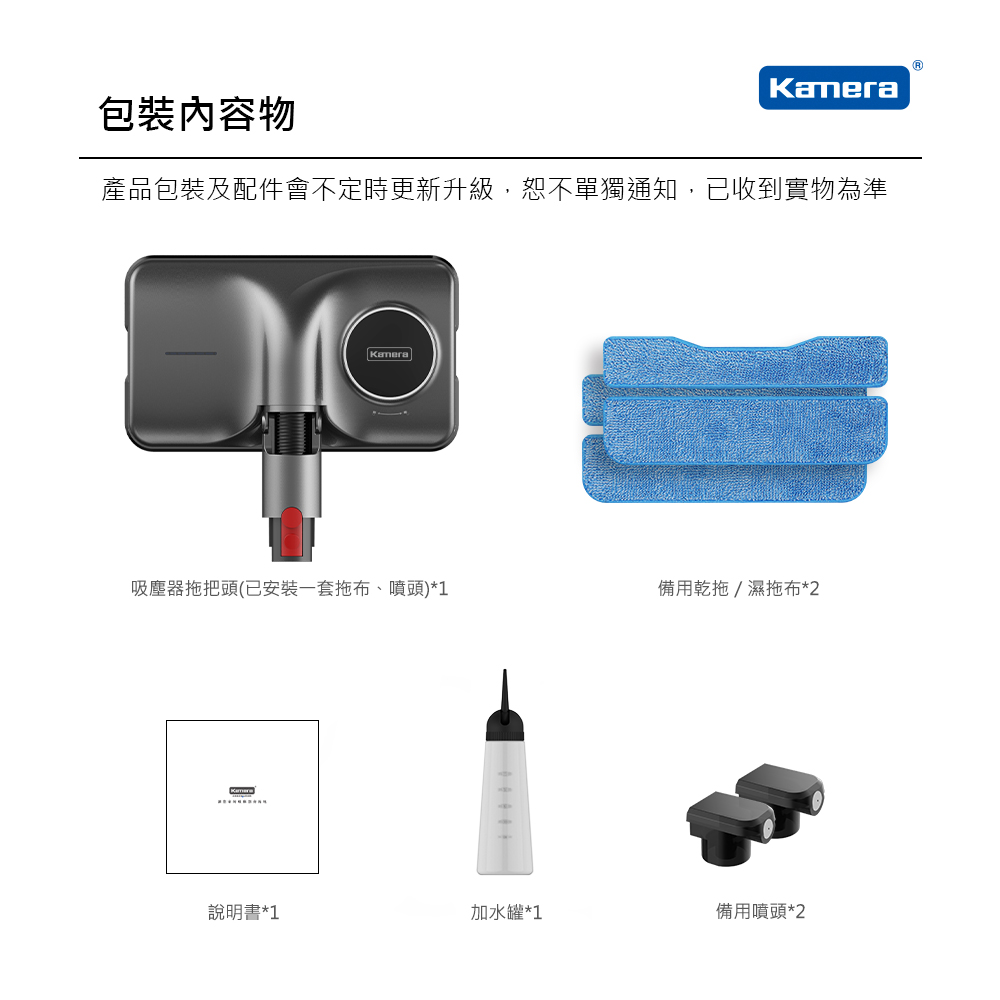 產品特點 ● 吸力足夠,除塵徹底● 外觀簡約大方,安裝快速又方便● 續航力極佳,使用噪音不大● 戴森吸塵器完美組合● 適用戴森V7、V8、V10、V11、V15● 邊拖邊吸,吸塵兼具擦地二合一的功能● 減輕媽媽家事吸塵拖地負擔,縮短打掃時間● 使用完成後只須清洗拖布,再搭配吸塵器掛架收納注意事項 1、本產品需搭配吸塵器使用,不能單獨使用。2、吸塵器拖把頭不能直接吸水,請嚴格參考說明書操作,戴森吸塵器主機不能進水,本公司不負擔操作之問題賠償,請留意。3、為產品水箱加水時,建議使用純淨水,請勿添加清潔劑等其他化學溶劑,以免造成機器內部零件損壞。請確認水質清潔無雜質,以免引起噴頭堵塞或水泵損壞等故障情況。4、每台吸塵器拖把頭出廠前均做過全面檢測,故機身內可能存有殘留水漬,實屬正常現象,請放心使用。 Q&A Q:可吸拖什麼地面? A:適用多種地面材質,如木質地板、大理石、磁磚地板…等。Q:什麼狀況會導致機器損壞? A:積水過多的地面不能直接使用,會傷害拖把頭導致吸塵器也會受損。
