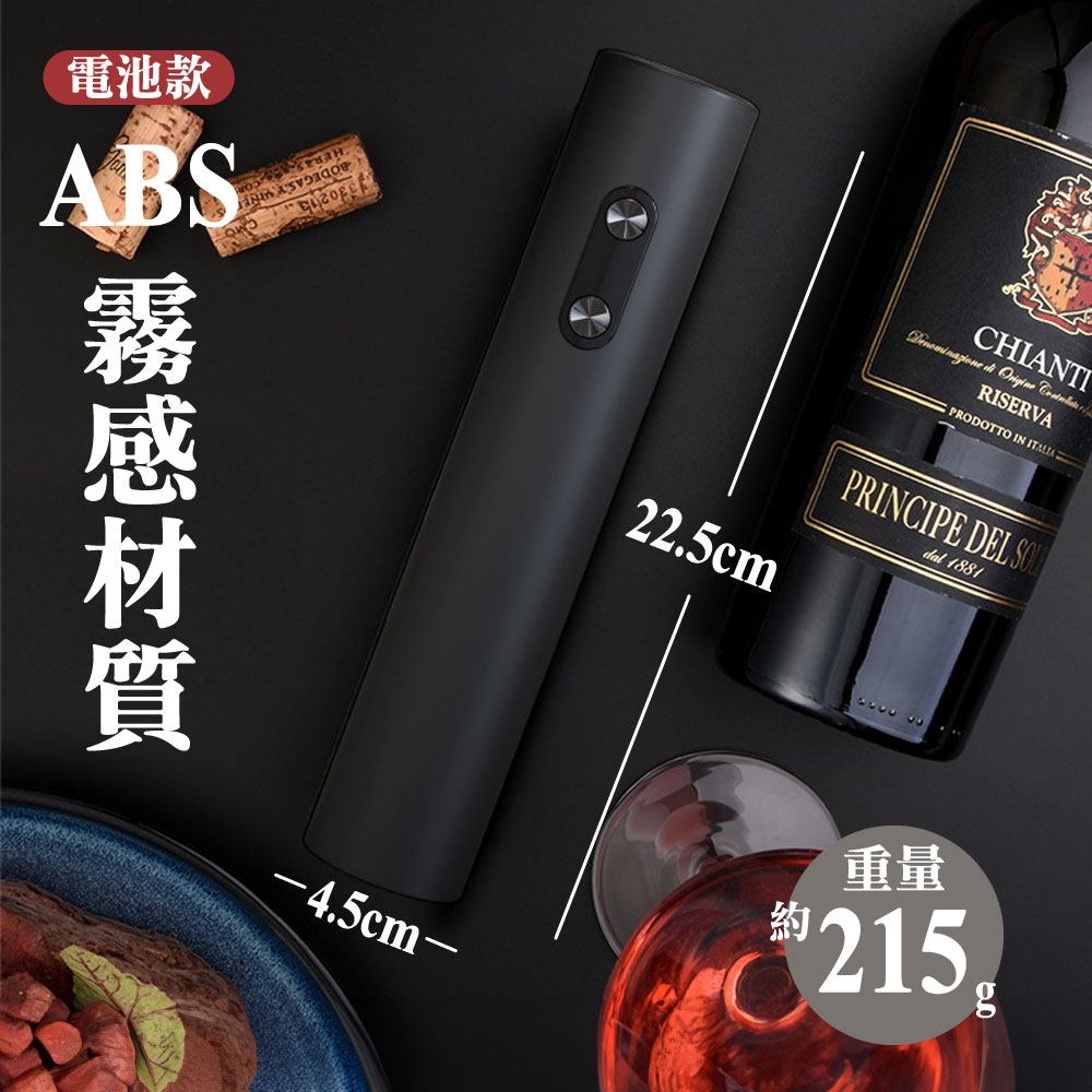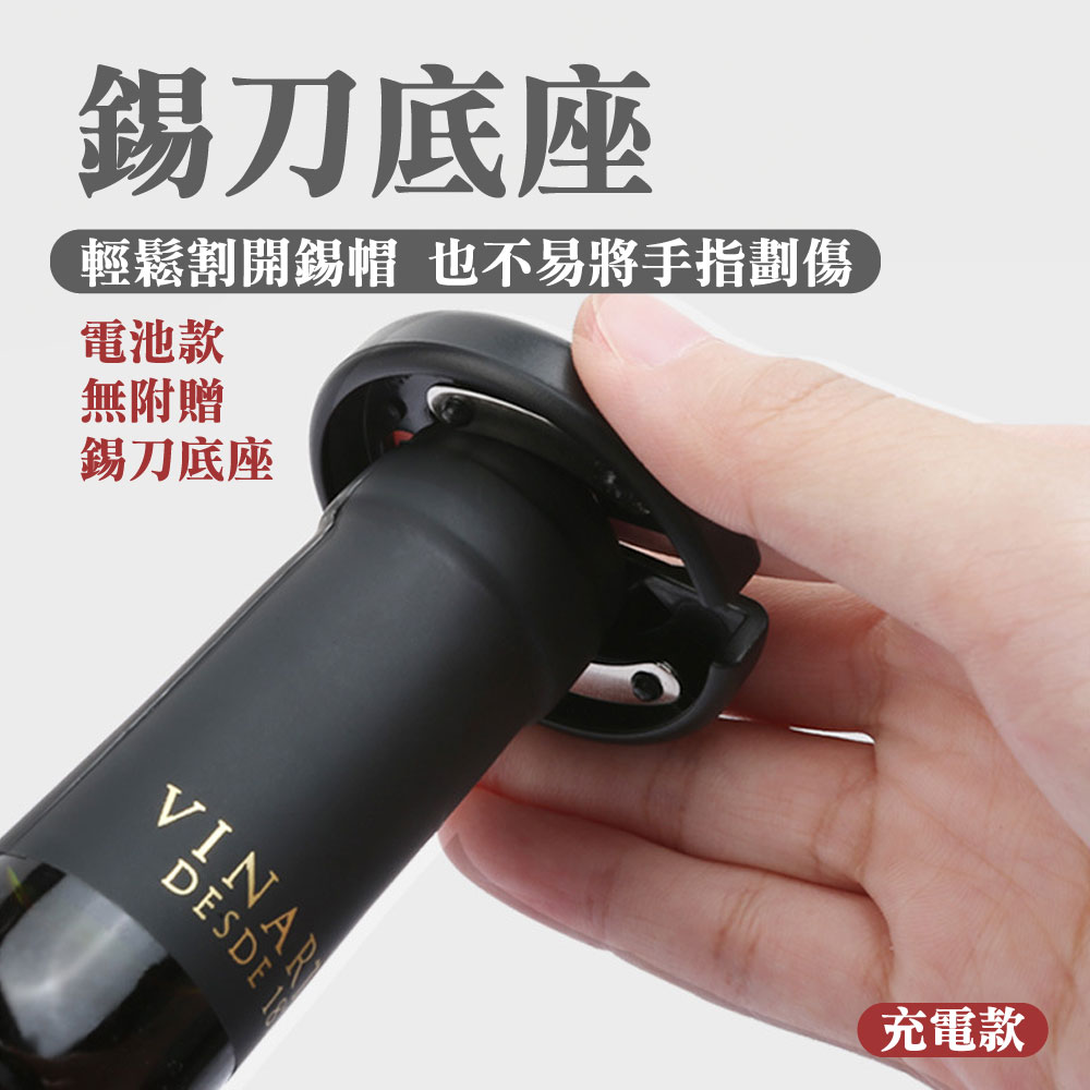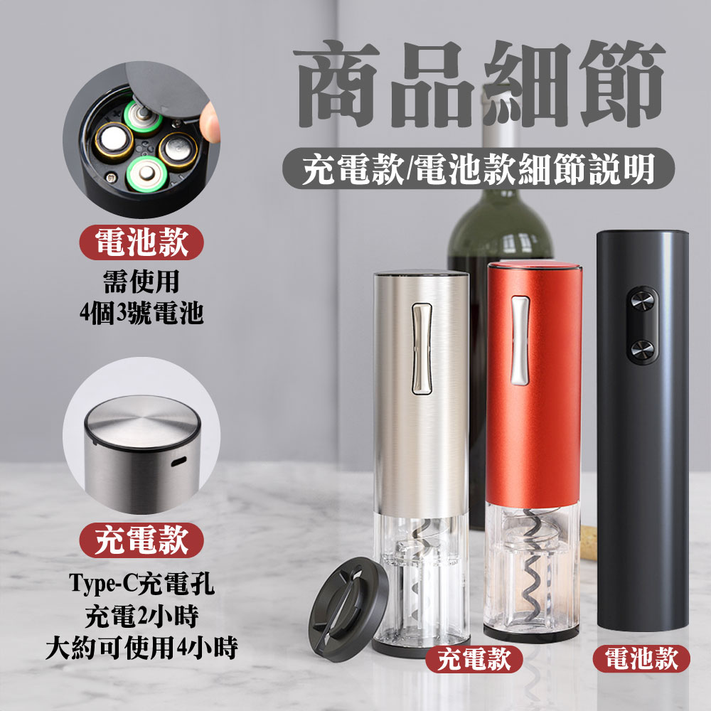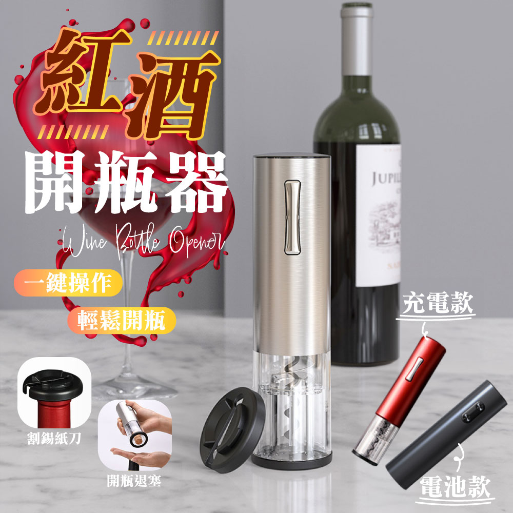 放假想在家小酌一下或是特殊的日子想開瓶紅白酒來慶祝一下是否會覺得:Ⓞ用傳統開瓶器覺得費時費力Ⓞ沒開好又容易損壞酒塞,以致於酒塞木屑掉入酒中Ⓞ還是女性要開瓶卻力氣不夠還要找人幫忙真麻煩你的心聲我們聽到了!!!推出了全新的「電動紅酒開瓶器」只要8秒、8秒、8秒即可輕鬆不費力的幫您開酒【產品特色】🍷金屬磨砂質感:機身外殼採用了鋁合金材質,手感厚實,表面應用了創新磨砂工藝,增添質感;別緻圓潤機身設計,便於一手掌控,開瓶手感舒適,握感輕盈!🍷35mm超大外徑:通過對模具的升級改良,擁有35mm超大外徑瓶口的兼容性,適用於市面上大多數瓶口,可以輕鬆開啟不同的酒瓶。🍷耀眼品質 藍光科技:特色設計按鍵版塊與開瓶透明區有藍光顯示,一開瓶就可以點亮。就算是在浪漫的夜晚,昏暗的燈光下,你的魅力也在暗自發光,不由自主的吸引到旁人的目光。🍷低秏電 超耐用:滿電電池可以連續開瓶80瓶以上🍷自動電量偵測:電量不夠按鍵燈會熄滅但仍可繼續開10-20瓶🍷多用途割錫紙刀:割錫紙刀的鋒利度經過上百次調試,即能輕鬆割開錫紙,又不易割傷手指。同時我們將期與底座完美結合,可輕鬆卡在開瓶器底蓋,從而使其有了3大功能:①防塵、②防丟、③也有效避免了兒童誤觸底部螺旋鈎發生危險!商品型號:充電款:KP3-361801C 🔋 / 電池款:KB1-602301 🔋商品選項:充電款:火紅/鋼鐵(附錫刀底座) 🔴🔧 / 電池款:霧黑(無錫刀底座) ⚫️商品材質:充電款:鋁合金、不鏽鋼、電子零件 🛠️ / 電池款:ABS材質、電子零件 🔌商品尺寸:充電款:18*4.5(直徑)cm 📏 / 電池款:22.5*4.5(直徑)cm 📏商品重量:充電款:255g ⚖️ / 電池款:210g ⚖️適用瓶口: ≦35mm的直口瓶和凸口瓶 🍷電池款: 安裝4個3號電池 🔋充電款: Type-C充電孔,充電2小時,使用時間約4小時 🔌使用方式:1.用割錫紙刀左右旋轉,割開瓶口密封的錫箔紙 ✂️2.垂直對準瓶塞中間,並握緊酒瓶和開瓶器 🍾3.持續按開瓶器拔塞鍵(按下鍵),直到瓶塞自動拔出 📥4.持續按開瓶器退塞鍵(按上鍵),直到軟木塞自動脫落 📤優雅開瓶:生活的儀式感,品嘗美酒享受生活 🍇🍷
