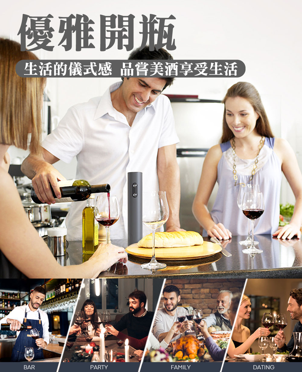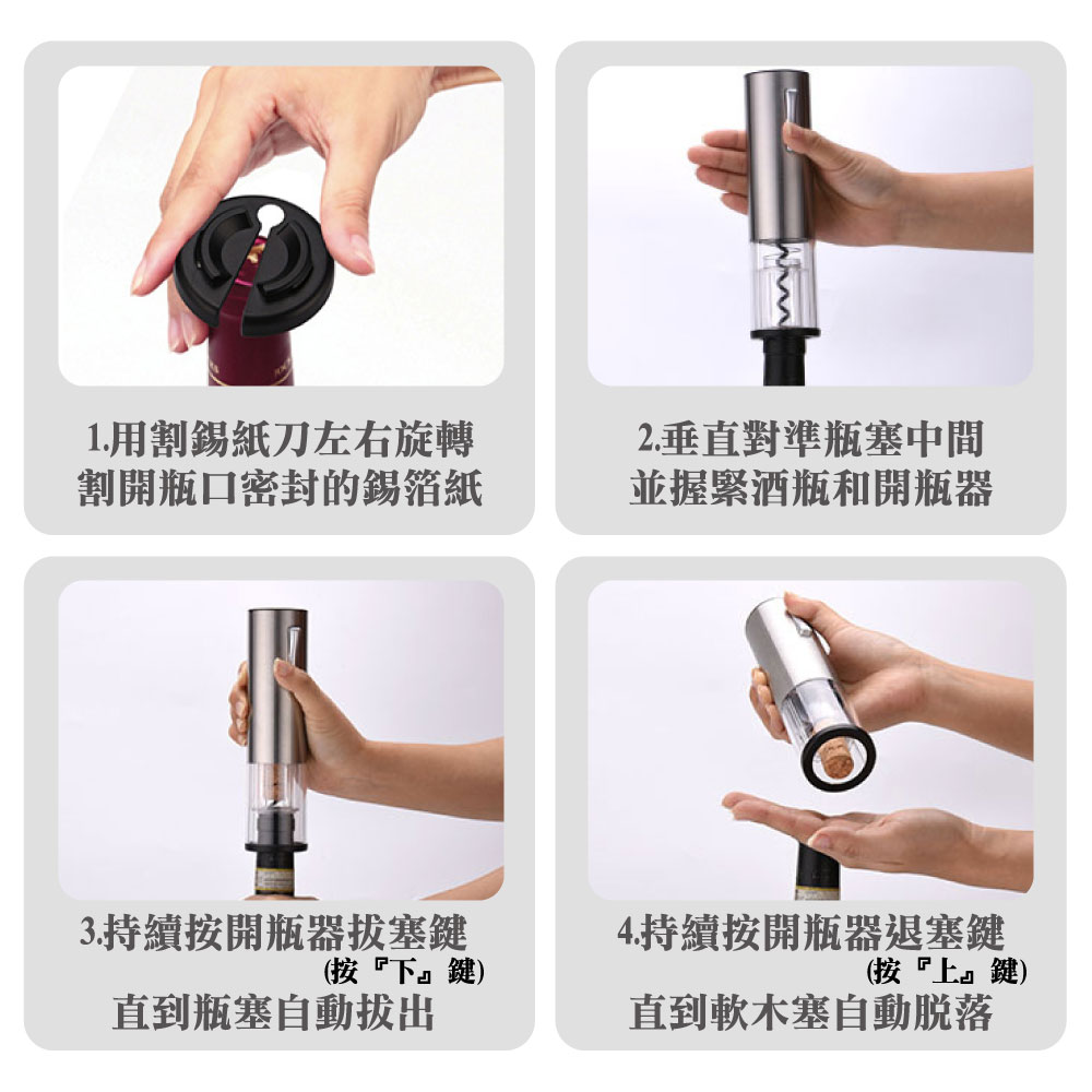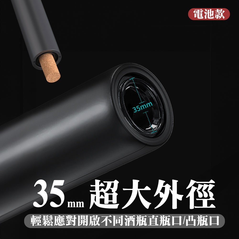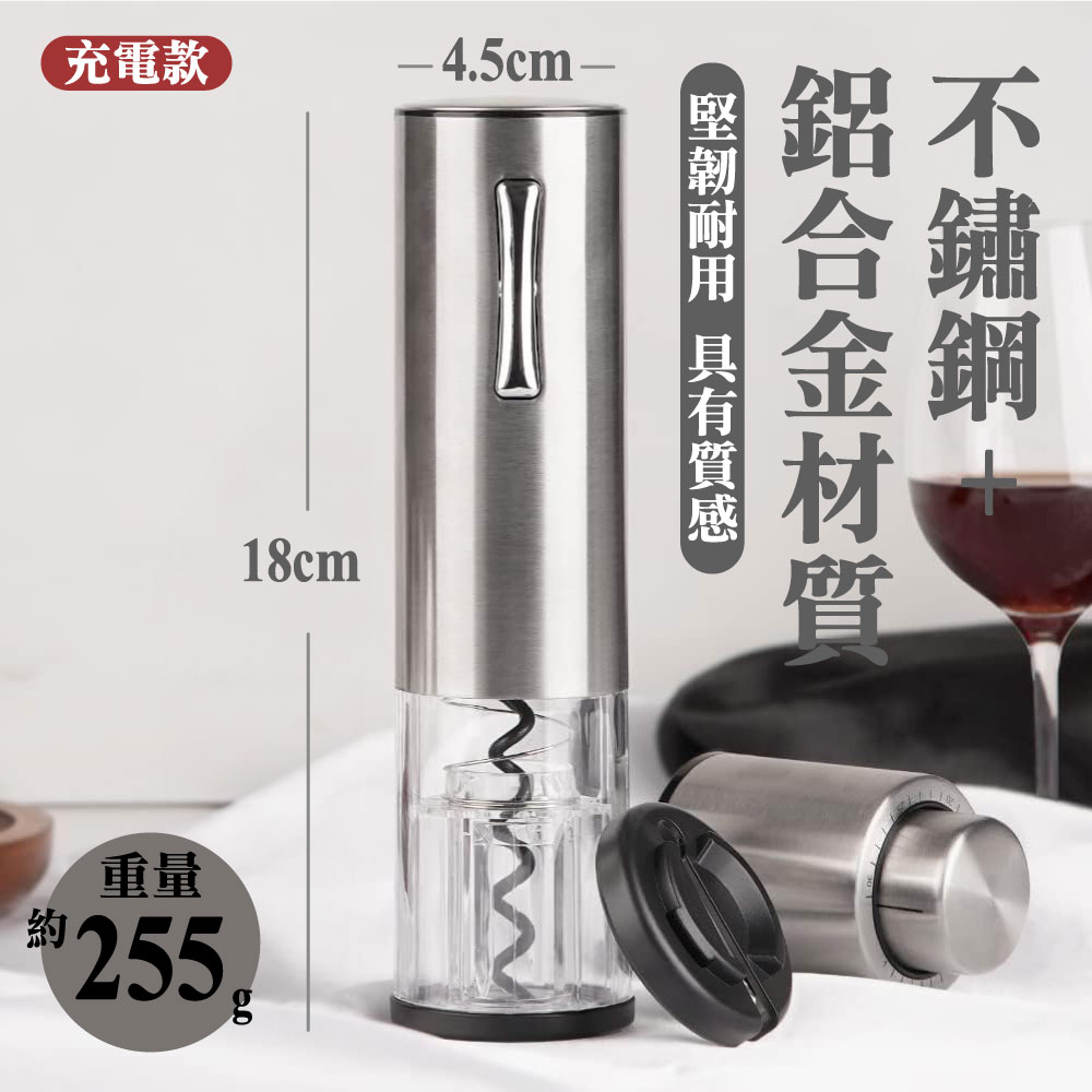 放假想在家小酌一下或是特殊的日子想開瓶紅白酒來慶祝一下是否會覺得:Ⓞ用傳統開瓶器覺得費時費力Ⓞ沒開好又容易損壞酒塞,以致於酒塞木屑掉入酒中Ⓞ還是女性要開瓶卻力氣不夠還要找人幫忙真麻煩你的心聲我們聽到了!!!推出了全新的「電動紅酒開瓶器」只要8秒、8秒、8秒即可輕鬆不費力的幫您開酒【產品特色】🍷金屬磨砂質感:機身外殼採用了鋁合金材質,手感厚實,表面應用了創新磨砂工藝,增添質感;別緻圓潤機身設計,便於一手掌控,開瓶手感舒適,握感輕盈!🍷35mm超大外徑:通過對模具的升級改良,擁有35mm超大外徑瓶口的兼容性,適用於市面上大多數瓶口,可以輕鬆開啟不同的酒瓶。🍷耀眼品質 藍光科技:特色設計按鍵版塊與開瓶透明區有藍光顯示,一開瓶就可以點亮。就算是在浪漫的夜晚,昏暗的燈光下,你的魅力也在暗自發光,不由自主的吸引到旁人的目光。🍷低秏電 超耐用:滿電電池可以連續開瓶80瓶以上🍷自動電量偵測:電量不夠按鍵燈會熄滅但仍可繼續開10-20瓶🍷多用途割錫紙刀:割錫紙刀的鋒利度經過上百次調試,即能輕鬆割開錫紙,又不易割傷手指。同時我們將期與底座完美結合,可輕鬆卡在開瓶器底蓋,從而使其有了3大功能:①防塵、②防丟、③也有效避免了兒童誤觸底部螺旋鈎發生危險!商品型號:充電款:KP3-361801C 🔋 / 電池款:KB1-602301 🔋商品選項:充電款:火紅/鋼鐵(附錫刀底座) 🔴🔧 / 電池款:霧黑(無錫刀底座) ⚫️商品材質:充電款:鋁合金、不鏽鋼、電子零件 🛠️ / 電池款:ABS材質、電子零件 🔌商品尺寸:充電款:18*4.5(直徑)cm 📏 / 電池款:22.5*4.5(直徑)cm 📏商品重量:充電款:255g ⚖️ / 電池款:210g ⚖️適用瓶口: ≦35mm的直口瓶和凸口瓶 🍷電池款: 安裝4個3號電池 🔋充電款: Type-C充電孔,充電2小時,使用時間約4小時 🔌使用方式:1.用割錫紙刀左右旋轉,割開瓶口密封的錫箔紙 ✂️2.垂直對準瓶塞中間,並握緊酒瓶和開瓶器 🍾3.持續按開瓶器拔塞鍵(按下鍵),直到瓶塞自動拔出 📥4.持續按開瓶器退塞鍵(按上鍵),直到軟木塞自動脫落 📤優雅開瓶:生活的儀式感,品嘗美酒享受生活 🍇🍷