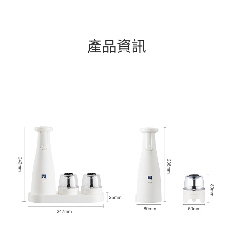 材質:香料罐-AS、托盤+外殼-ABS、 磨芯-陶瓷鋰電池容量:1500mAh產品內容:研磨器x1、香料罐x2、底座(托盤)x1、USB充電線x1、說明書x1