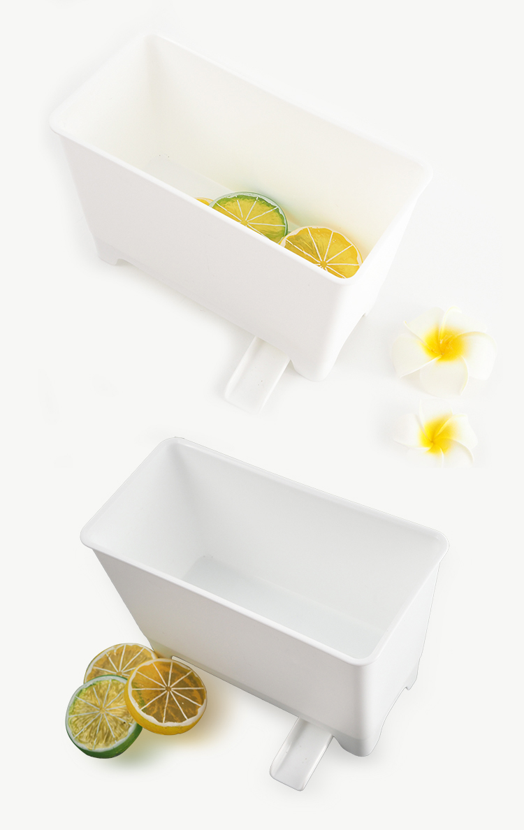 烹飪前少不了水槽邊的前置作業,切菜梗、拔蔬果蒂頭等,切片備料後廚餘放入水槽邊的流理台瀝水小物籃,阻隔飯菜、殘渣直接掉入水管日積月累,產生發臭、阻塞的困擾,附瀝水架把水排入水槽,保持水槽的清潔。