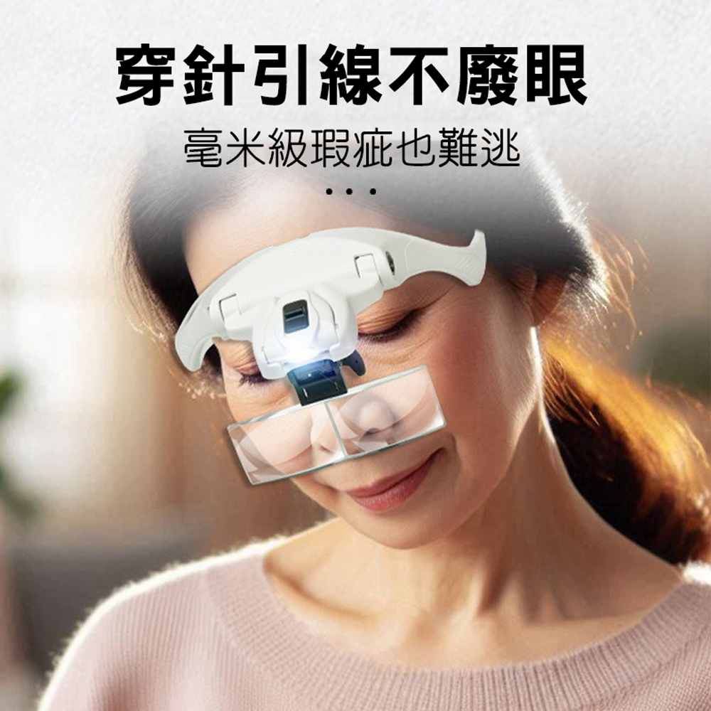 內容物:頭戴式放大鏡x 1、鏡片收納盒x 1 (內含五片不同倍率鏡片、鬆緊頭帶x 1、說明書(英文 ) x 1、擦拭布x 1