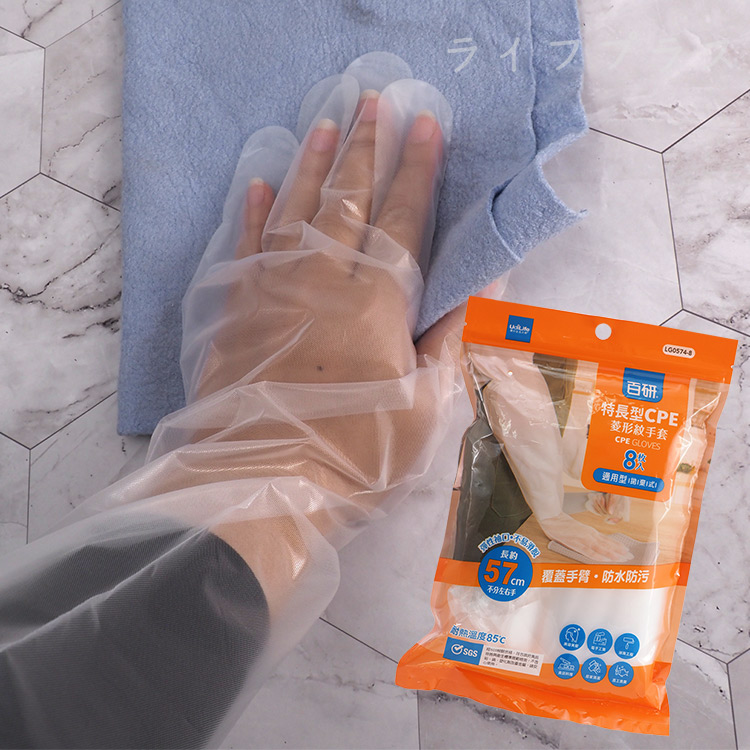通過SGS檢驗合格使用安心,手掌防滑顆粒有效止滑,不分左右手,特長設計約57cm覆蓋手臂,彈性袖口好穿好脫不易滑脫,通用型多用途使用,適用於炊事清潔、環境掃除、廚房油污、衣物洗滌等各項清潔工作。