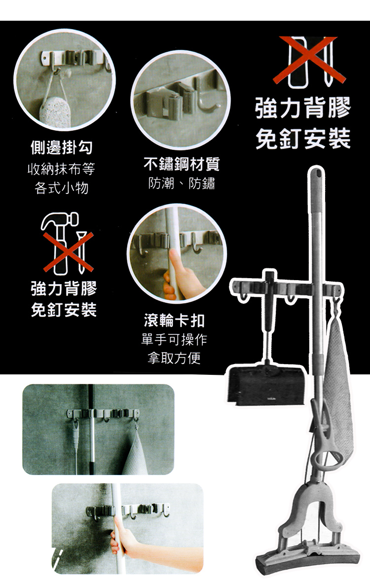 極簡設計收納方便,簡單安裝免釘免鑽孔,強力背膠隨意黏貼黏貼性強,可隨意黏貼瓷磚、大理石、木板、塑膠、金屬,撕除不殘膠不傷牆面,使用304不鏽鋼材質,堅固耐用,不易損傷,吊掛不佔空間 ,是您收納整理好幫手,可將各類工具、器具有效管理,創造整齊美觀的空間,滾輪卡扣好拿好掛不費力,舉凡有把手類型的工具均能適用,特殊掛勾設計可懸掛各種清潔工具或有握把工具,管徑或握把過大則可利用掛孔旁的掛勾做懸吊,能穩定又安全的緊握各項工具,安全不掉落。