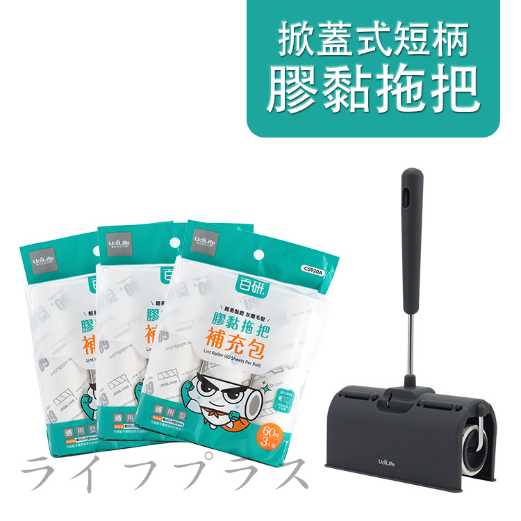 掀蓋式短柄膠黏拖把-60周-1支+百研/通用型膠黏補充包/60周-3入×3包-1組