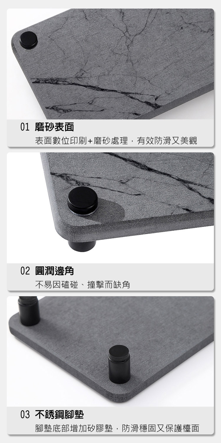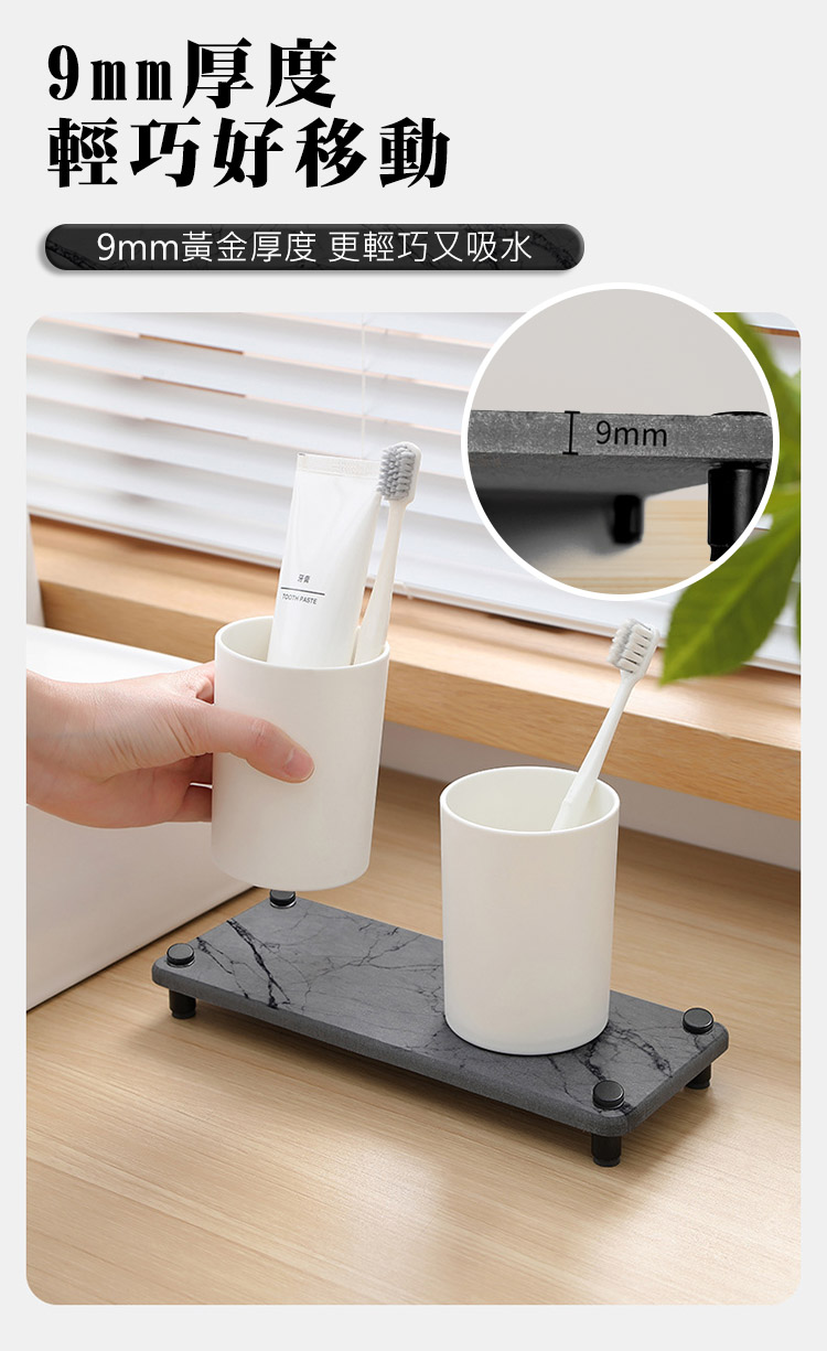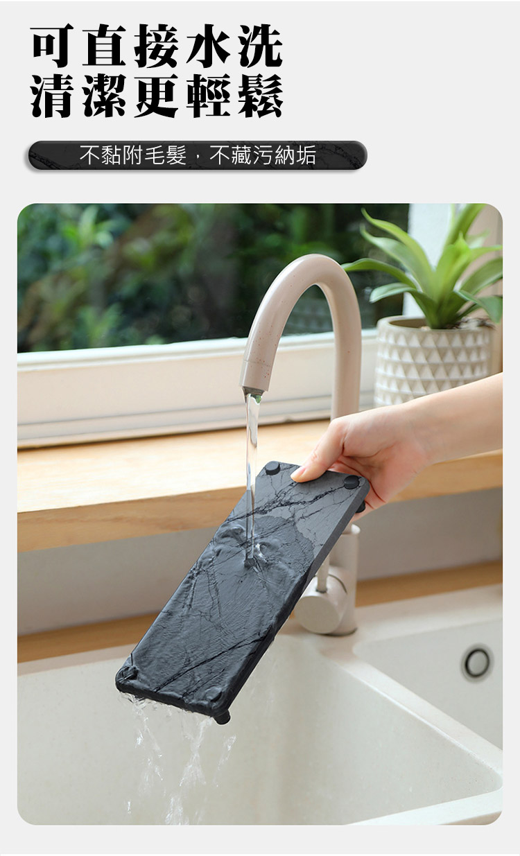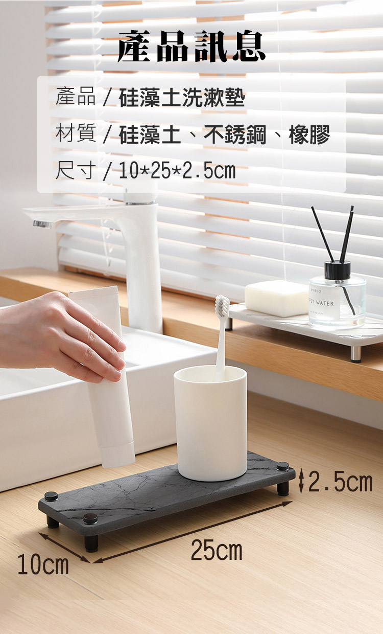 精緻的三色大理石花紋為您的洗漱區或廚房增添了一抹現代感不僅適用於擺放刷牙用品和化妝品還能置於小盆栽下方吸水保持乾燥設計簡約優雅,為您的生活空間增色不少【產品訊息】產品/硅藻土洗漱墊材質/硅藻土、不銹鋼、橡膠尺寸/10*25*2.5cm