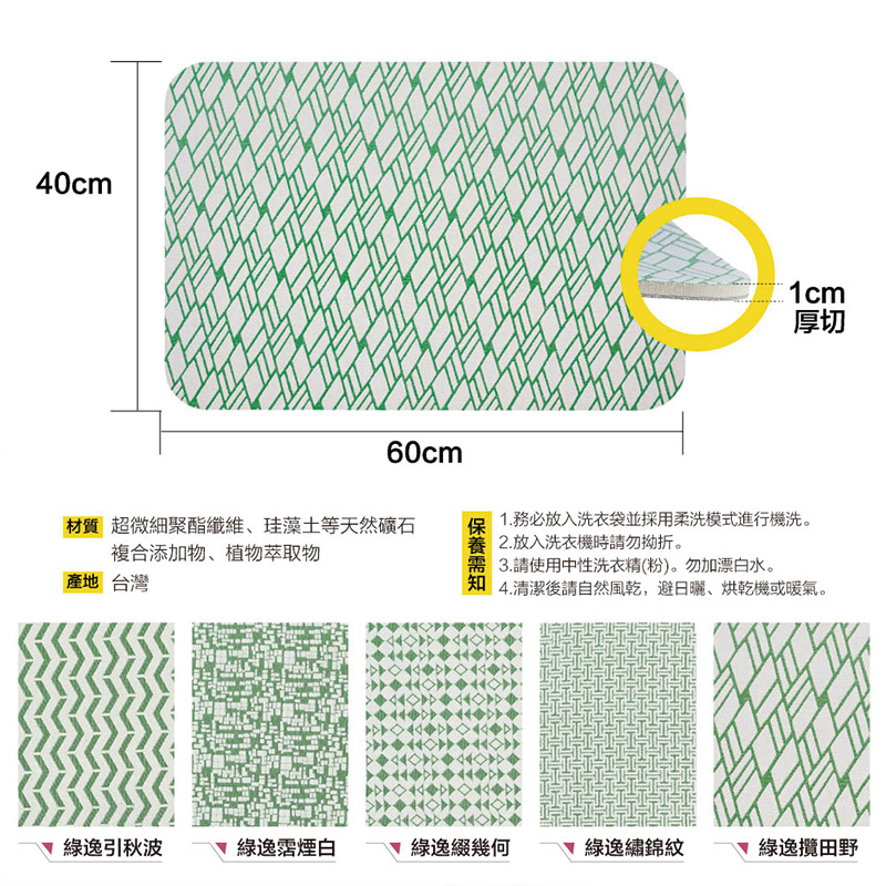 【怪獸】OGL 厚切特舒緹花布軟式珪藻土吸水地墊(60x40cm) -綠逸霑煙白
