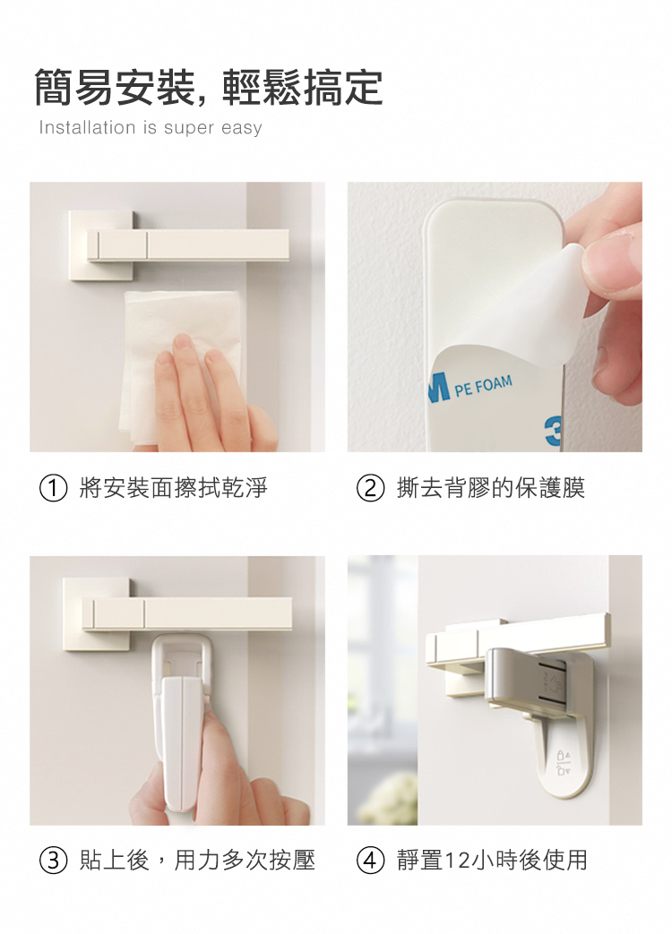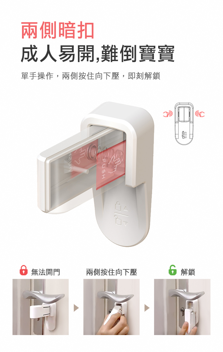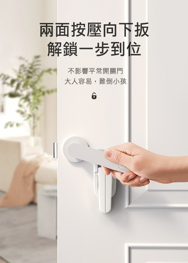這款雙側按壓門把安全鎖,專為有幼兒或寵物的家庭設計,能有效防止他們誤開房門,避免獨自探索未知世界的危險。簡易黏貼安裝,不影響日常開關門,卻能將潛在風險隔絕於門外,讓您更放心。